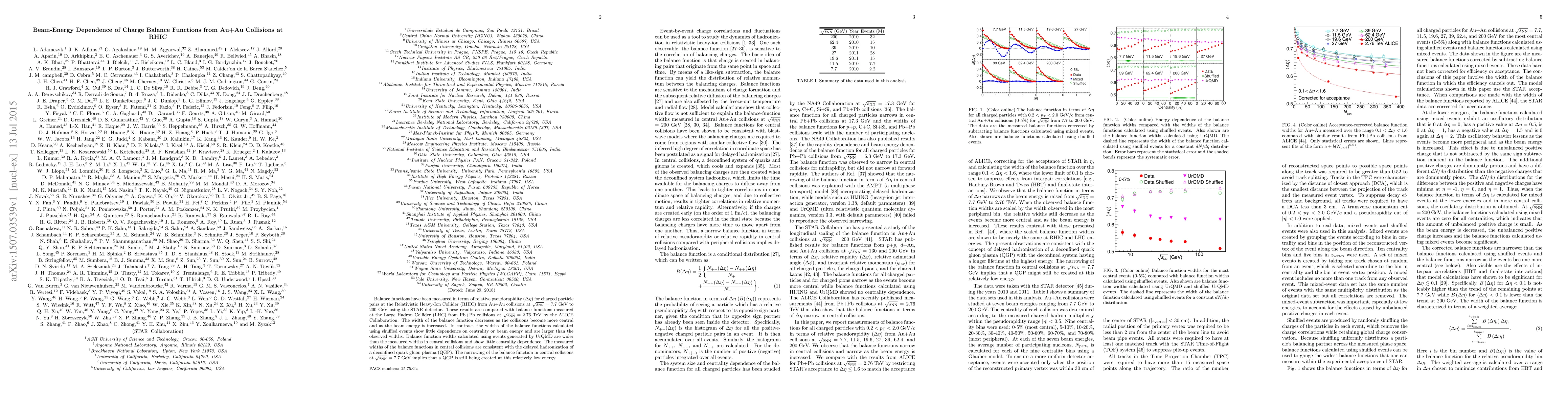 This study measures the beam-energy dependence of balance functions from Au+Au collisions at RHIC, revealing that the width of these functions decreases with increased beam energy and more central collisions, suggesting the formation of a deconfined quark gluon plasma. The results contrast with shuffled event calculations and UrQMD simulations, supporting the delayed hadronization interpretation.