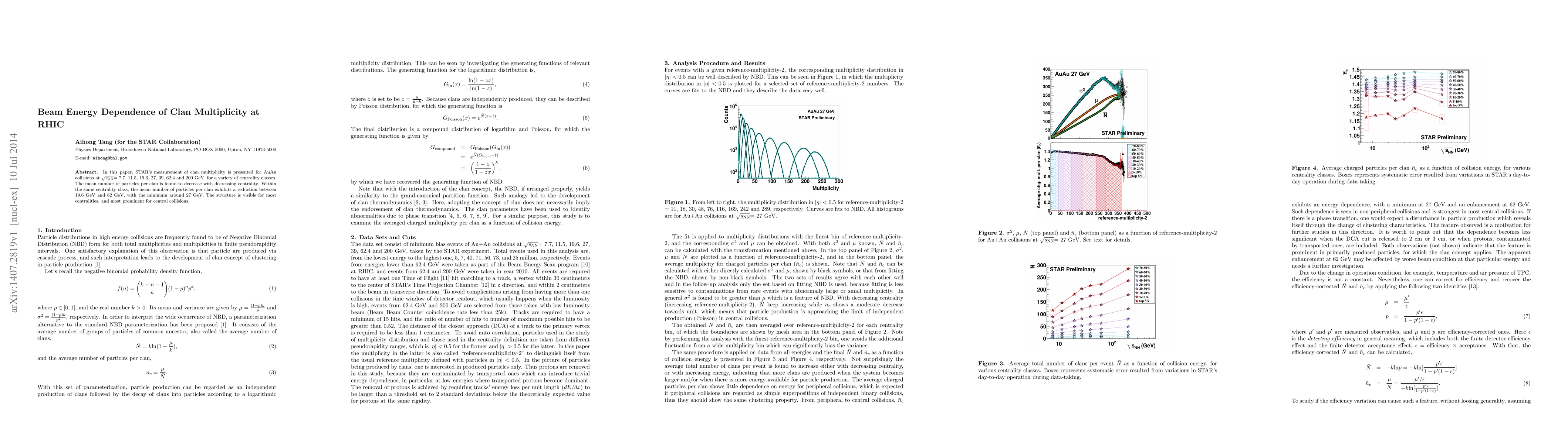 In this paper, STAR's measurement of clan multiplicity is presented for AuAu collisions at $\sqrt{s_\mathrm{NN}}$ = 7.7, 11.5, 19.6, 27, 39, 62.4 and 200 GeV, for a variety of centrality classes. The mean number of particles per clan is found to decrease with decreasing centrality. Within the same centrality class, the mean number of particles per clan exhibits a reduction between 19.6 GeV and 62 GeV, with the minimum around 27 GeV. The structure is visible for most centralities, and most prominent for central collisions.