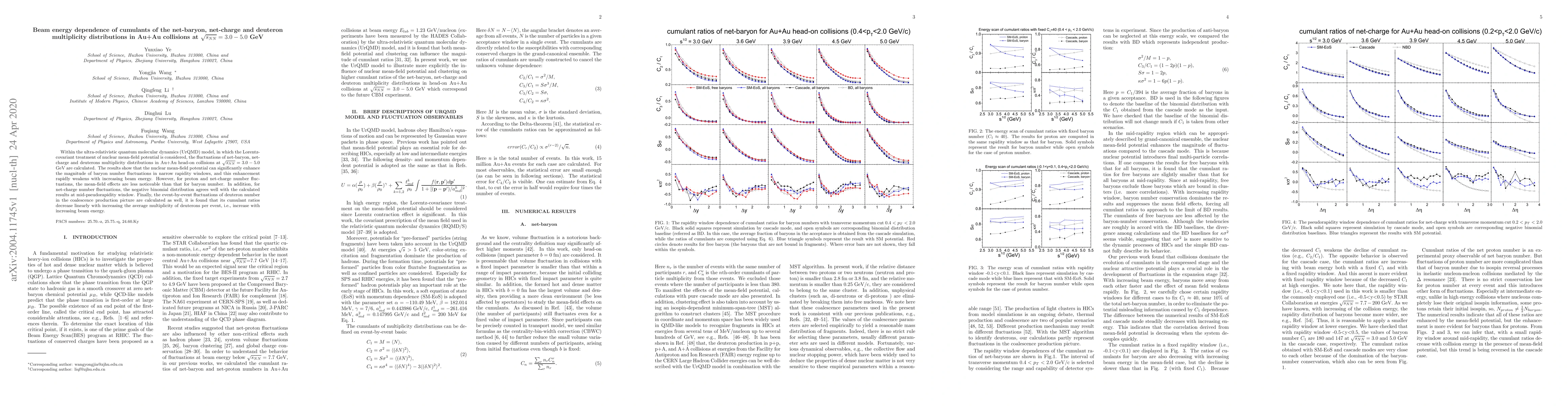 This study uses the ultra-relativistic quantum molecular dynamics (UrQMD) model to analyze fluctuations in net-baryon, net-charge, and deuteron multiplicity distributions in Au+Au collisions at $\sqrt{s_{NN}}=3.0-5.0$ GeV. The nuclear mean-field potential significantly enhances baryon number fluctuations, which weaken with higher beam energy, while deuteron cumulant ratios decrease linearly with increasing deuteron multiplicity per event.