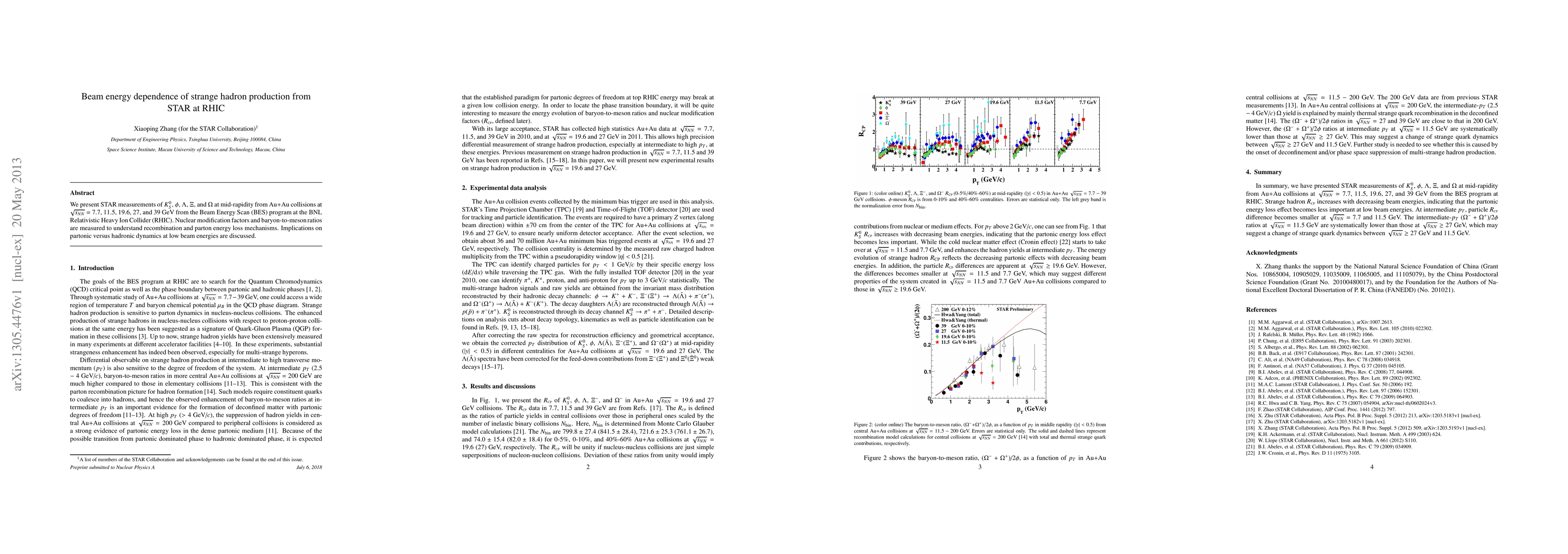 Researchers measured strange hadron production in Au+Au collisions at different beam energies, finding that nuclear modification factors vary with energy, and baryon-to-meson ratios provide insights into recombination mechanisms.