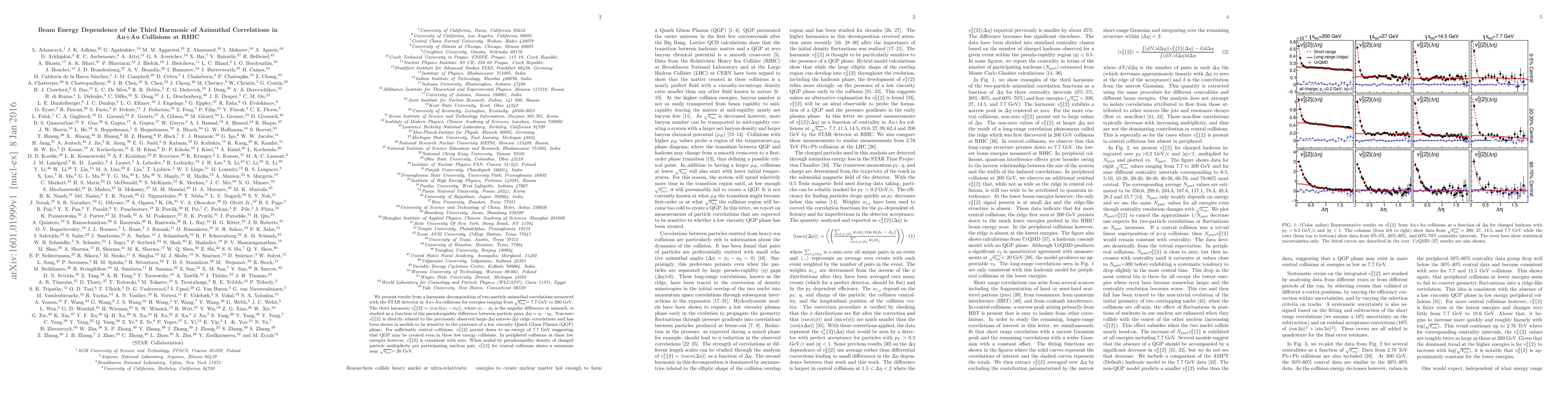 This study investigates the third harmonic $v_3^2\{2\}$ of azimuthal correlations in Au+Au collisions at RHIC from $\sqrt{s_{NN}}=7.7$ GeV to 200 GeV, revealing that a low viscosity Quark Gluon Plasma (QGP) may form even in low-energy collisions, though not in peripheral ones. The analysis shows a minimum in $v_3^2\{2\}$ near $\sqrt{s_{NN}}=20$ GeV when scaled by pseudorapidity density.