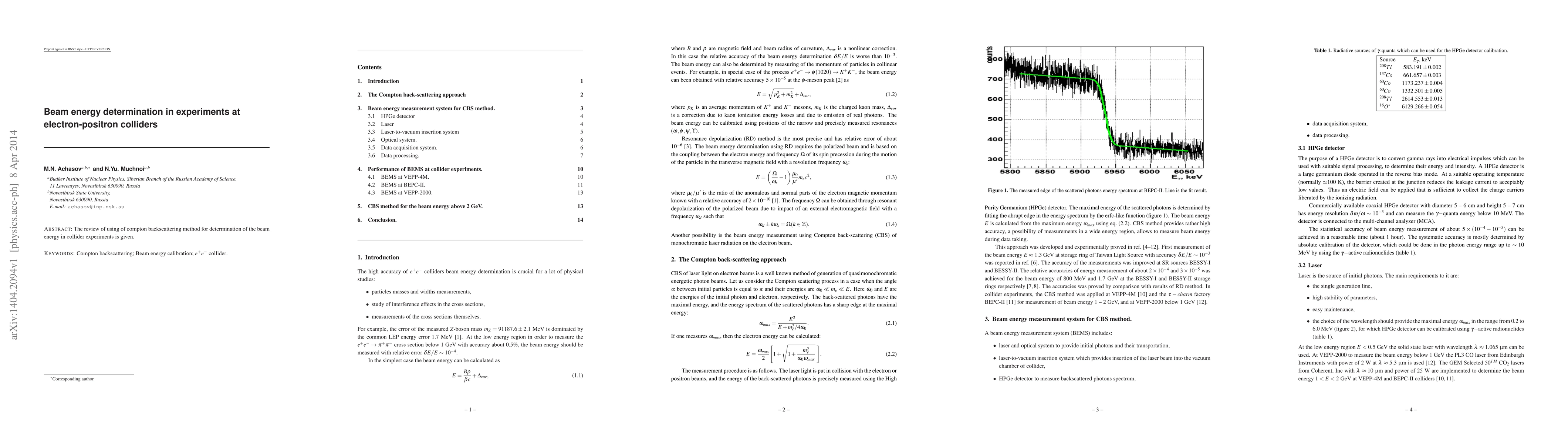 The review of using of compton backscattering method for determination of the beam energy in collider experiments is given.