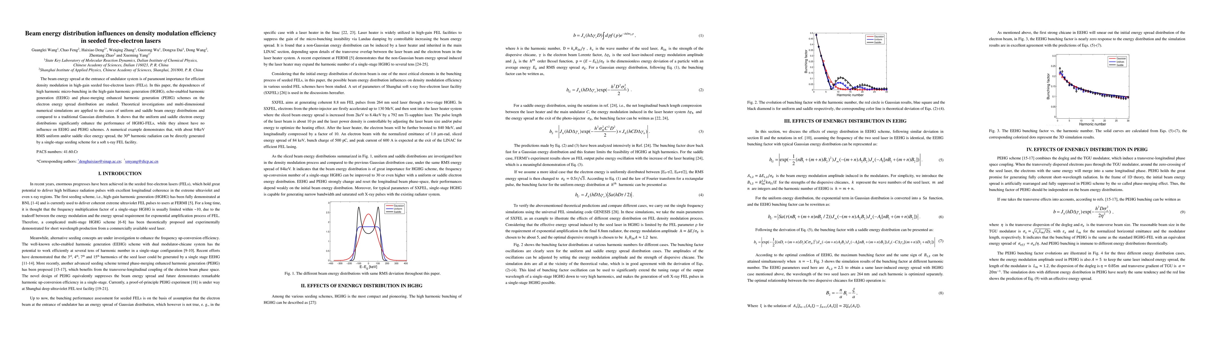 This paper investigates how different beam energy distributions affect density modulation efficiency in seeded free-electron lasers, finding that uniform and saddle distributions significantly boost high-gain harmonic generation performance, while having minimal impact on other schemes. Numerical simulations show that a 84keV RMS uniform/saddle slice energy spread can enable direct generation of the 30th harmonic in a single-stage seeding scheme for soft x-ray FELs.