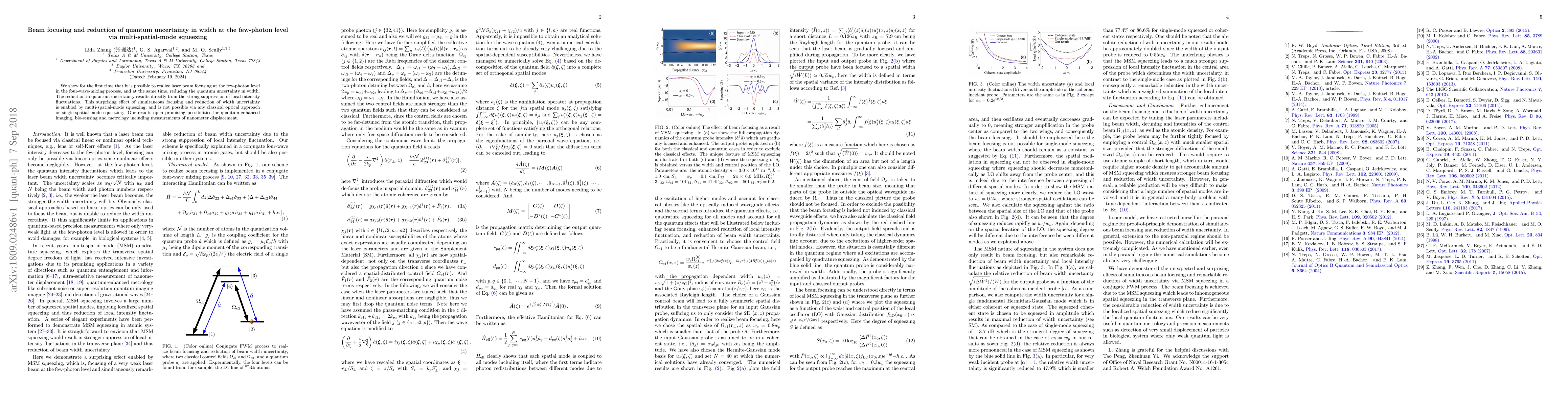 We show for the first time that it is possible to realize laser beam focusing at the few-photon level in the four-wave-mixing process, and at the same time, reducing the quantum uncertainty in width. The reduction in quantum uncertainty results directly from the strong suppression of local intensity fluctuations. This surprising effect of simultaneous focusing and reduction of width uncertainty is enabled by multi-spatial-mode squeezing, and is not possible via any classical optical approach or single-spatial-mode squeezing. Our results open promising possibilities for quantum-enhanced imaging, bio-sensing and metrology including measurements of nanometer displacement.
