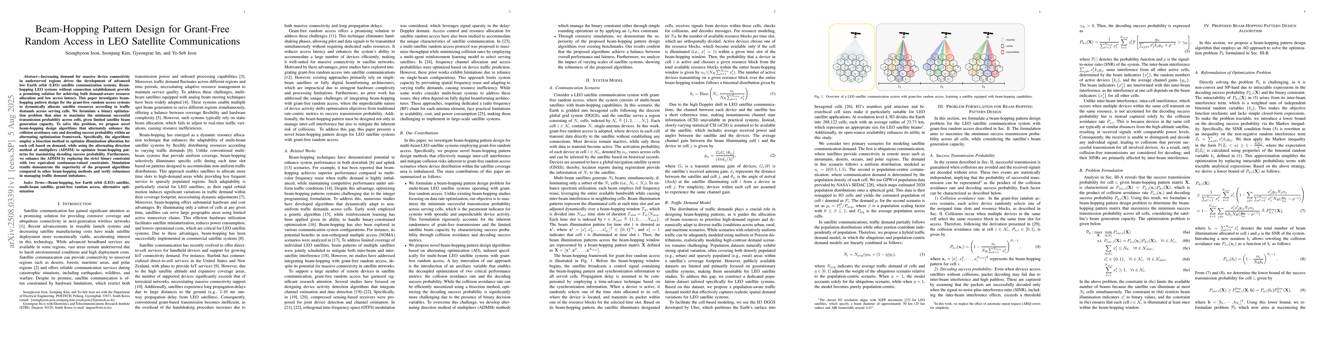 Increasing demand for massive device connectivity in underserved regions drives the development of advanced low Earth orbit (LEO) satellite communication systems. Beam-hopping LEO systems without connection establishment provide a promising solution for achieving both demand-aware resource allocation and low access latency. This paper investigates beam-hopping pattern design for the grant-free random access systems to dynamically allocate satellite resources according to traffic demands across serving cells. We formulate a binary optimization problem that aims to maximize the minimum successful transmission probability across cells, given limited satellite beam generation capacity. To solve this problem, we propose novel beam-hopping design algorithms that alternately enhance the collision avoidance rate and decoding success probability within an alternating optimization framework. Specifically, the algorithms employ a bisection method to optimize illumination allocation for each cell based on demand, while using the alternating direction method of multipliers (ADMM) to optimize beam-hopping patterns for maximizing decoding success probability. Furthermore, we enhance the ADMM by replacing the strict binary constraint with two equivalent continuous-valued constraints. Simulation results demonstrate the superiority of the proposed algorithms compared to other beam-hopping methods and verify robustness in managing traffic demand imbalance.