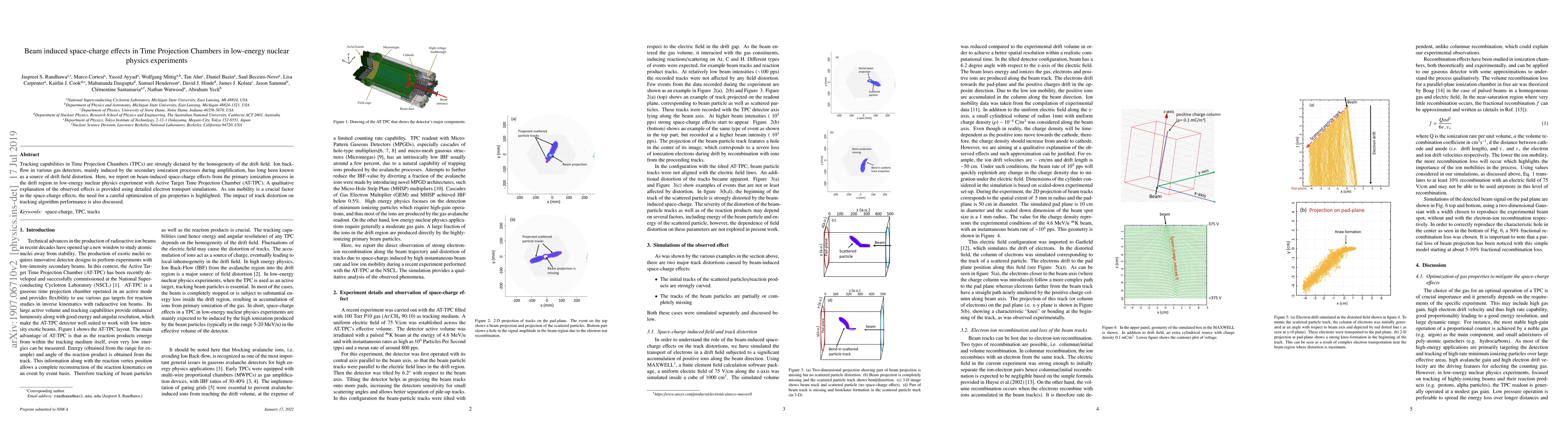 Tracking capabilities in Time Projection Chambers (TPCs) are strongly dictated by the homogeneity of the drift field. Ion back-flow in various gas detectors, mainly induced by the secondary ionization processes during amplification, has long been known as a source of drift field distortion. Here, we report on beam-induced space-charge effects from the primary ionization process in the drift region in low-energy nuclear physics experiment with Active Target Time Projection Chamber (AT-TPC). A qualitative explanation of the observed effects is provided using detailed electron transport simulations. As ion mobility is a crucial factor in the space-charge effects, the need for a careful optimization of gas properties is highlighted. The impact of track distortion on tracking algorithm performance is also discussed.
