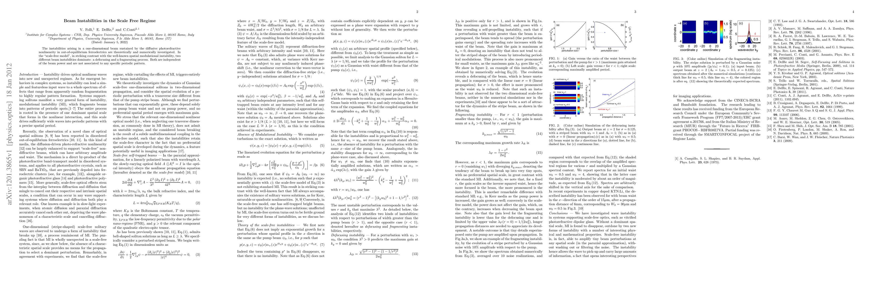 The paper investigates beam instabilities in one-dimensional beams using a scale-free model, revealing two dominant instabilities: defocusing and fragmenting, which occur independently of beam power and do not rely on specific patterns.