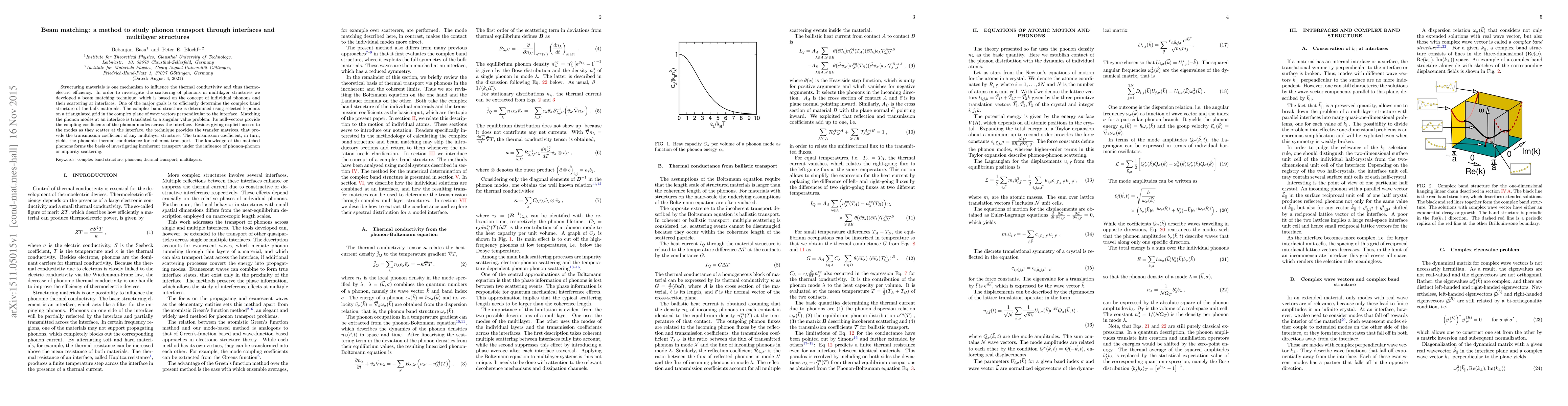 Structuring materials is one mechanism to influence the thermal conductivity and thus thermoelectric efficiency. In order to investigate the scattering of phonons in multilayer structures we developed a beam matching technique, which is based on the concept of individual phonons and their scattering at interfaces. One of the major goals is to efficiently determine the complex band structure of the bulk materials. The complex band structure is determined using selected k-points on a triangulated grid in the complex plane of wave vectors perpendicular to the interface. Matching the phonon modes at an interface is translated to a singular value problem. Its null-vectors provide the coupling coefficients of the phonon modes across the interface. Besides giving explicit access to the modes as they scatter at the interface, the technique provides the transfer matrices, that provide the transmission coefficient of any multilayer structure. The transmission coefficient, in turn, yields the phononic thermal conductance for coherent transport. The knowledge of the matched phonons forms the basis of investigating incoherent transport under the influence of phonon-phonon or impurity scattering.