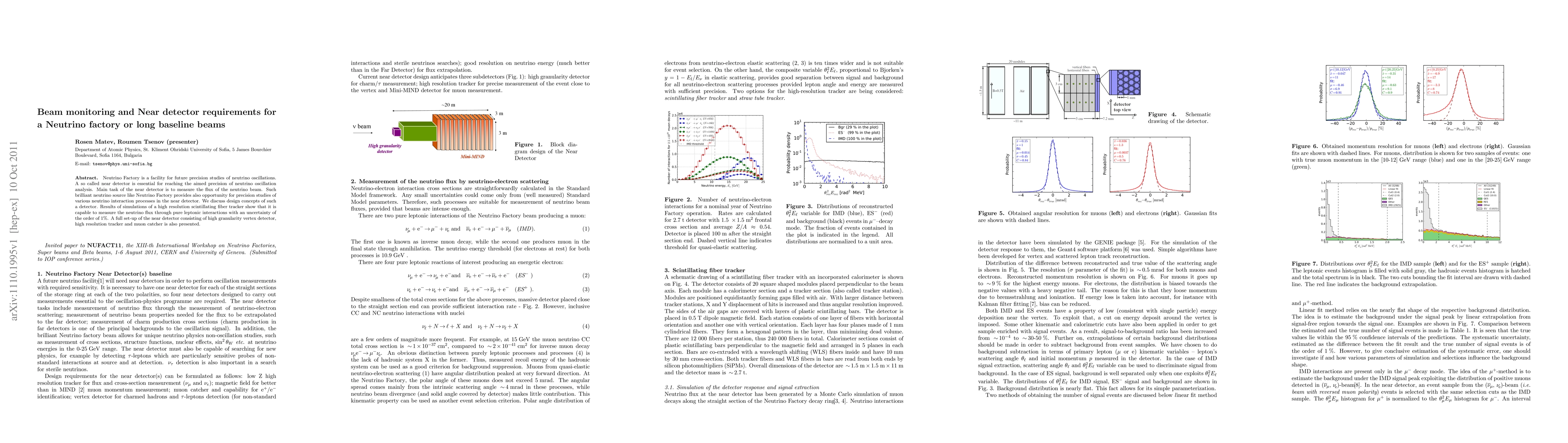 Neutrino Factory is a facility for future precision studies of neutrino oscillations. A so called near detector is essential for reaching the aimed precision of neutrino oscillation analysis. Main task of the near detector is to measure the flux of the neutrino beam. Such brilliant neutrino source like Neutrino Factory provides also opportunity for precision studies of various neutrino interaction processes in the near detector. We discuss design concepts of such a detector. Results of simulations of a high resolution scintillating fiber tracker show that it is capable to measure the neutrino flux through pure leptonic interactions with an uncertainty of the order of 1%. A full set-up of the near detector consisting of high granularity vertex detector, high resolution tracker and muon catcher is also presented.