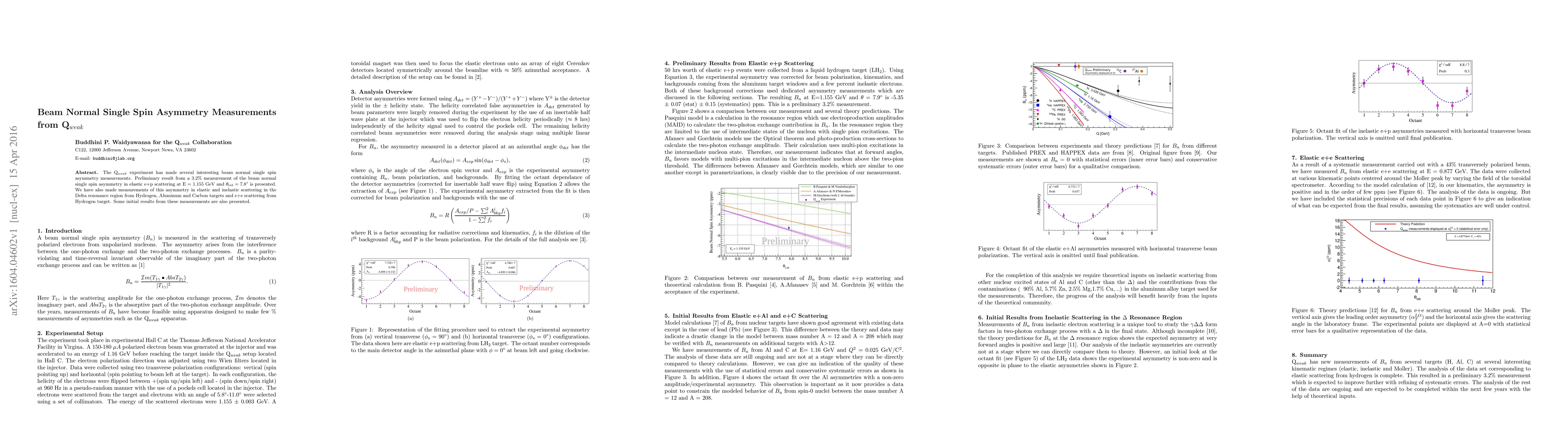 The Q weak experiment has made several interesting beam normal single spin asymmetry measurements. Preliminary result from a 3.2% measurement of the beam normal single spin asymmetry in elastic e+p scattering at E = 1.155 GeV and {\theta} lab = 7.8(deg) is presented. We have also made measurements of this asymmetry in elastic and inelastic scattering in the Delta resonance region from Hydrogen, Aluminum and Carbon targets and e+e scattering from Hydrogen target. Some initial results from these measurements are also presented.