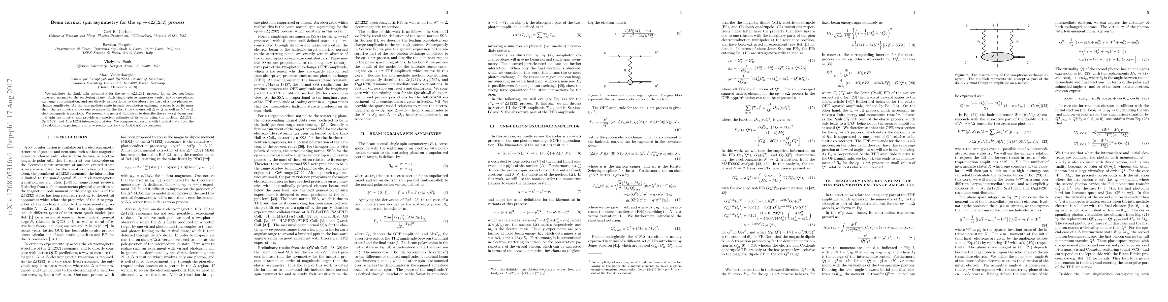 This paper calculates the beam normal spin asymmetry for the $e p \to e \Delta(1232)$ process, revealing insights into on-shell electromagnetic transitions via two-photon exchange. The results are compared with initial Qweak@JLab data and predictions are made for the A4@MAMI experiment.