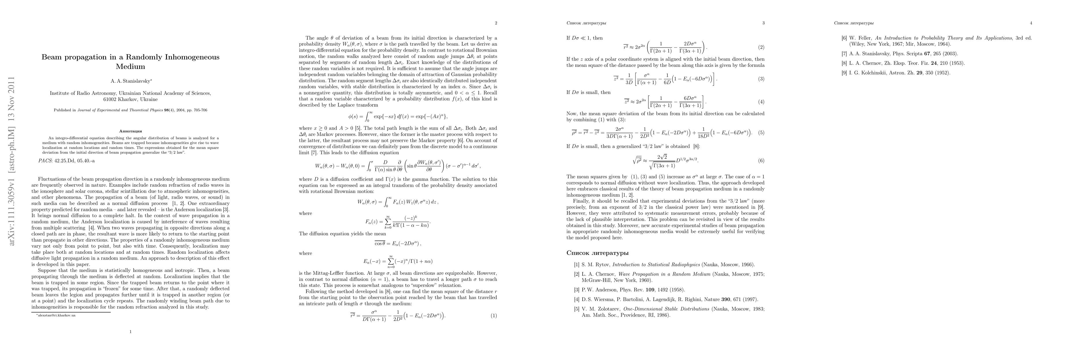 This paper analyzes an integro-differential equation to describe the angular distribution of beams in a randomly inhomogeneous medium, revealing that inhomogeneities cause wave localization and beam trapping. The study generalizes the "3/2 law" to account for mean square deviation from the initial beam propagation direction.