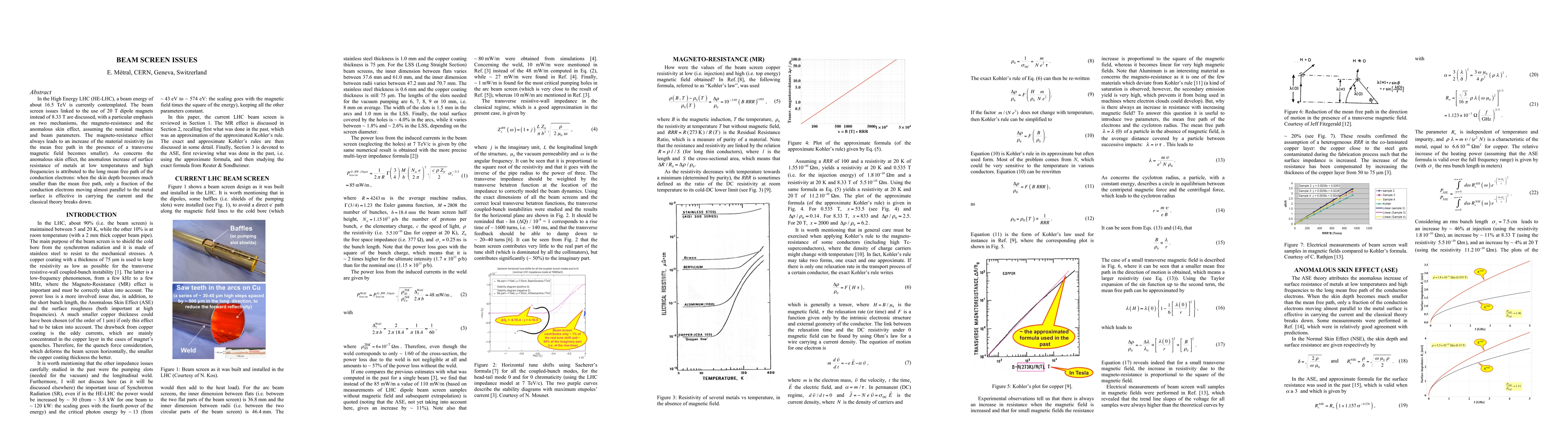 In the High Energy LHC (HE-LHC), a beam energy of about 16.5 TeV is currently contemplated. The beam screen issues linked to the use of 20 T dipole magnets instead of 8.33 T are discussed, with a particular emphasis on two mechanisms, the magneto-resistance and the anomalous skin effect, assuming the nominal machine and beam parameters. The magneto-resistance effect always leads to an increase of the material resistivity (as the mean free path in the presence of a transverse magnetic field becomes smaller). As concerns the anomalous skin effect, the anomalous increase of surface resistance of metals at low temperatures and high frequencies is attributed to the long mean free path of the conduction electrons: when the skin depth becomes much smaller than the mean free path, only a fraction of the conduction electrons moving almost parallel to the metal surface is effective in carrying the current and the classical theory breaks down.