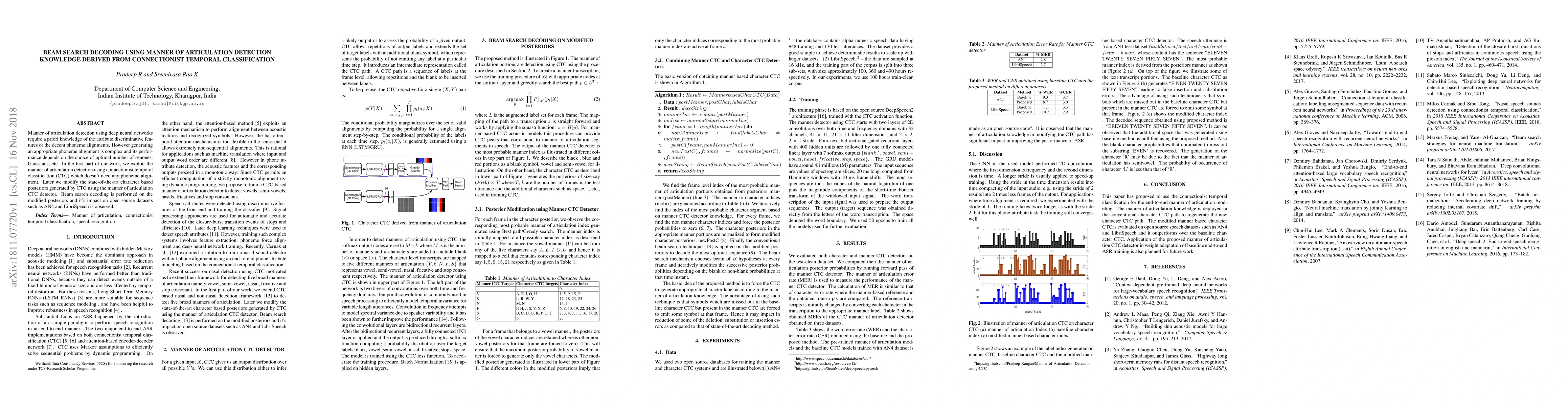 Manner of articulation detection using deep neural networks require a priori knowledge of the attribute discriminative features or the decent phoneme alignments. However generating an appropriate phoneme alignment is complex and its performance depends on the choice of optimal number of senones, Gaussians, etc. In the first part of our work, we exploit the manner of articulation detection using connectionist temporal classification (CTC) which doesn't need any phoneme alignment. Later we modify the state-of-the-art character based posteriors generated by CTC using the manner of articulation CTC detector. Beam search decoding is performed on the modified posteriors and it's impact on open source datasets such as AN4 and LibriSpeech is observed.