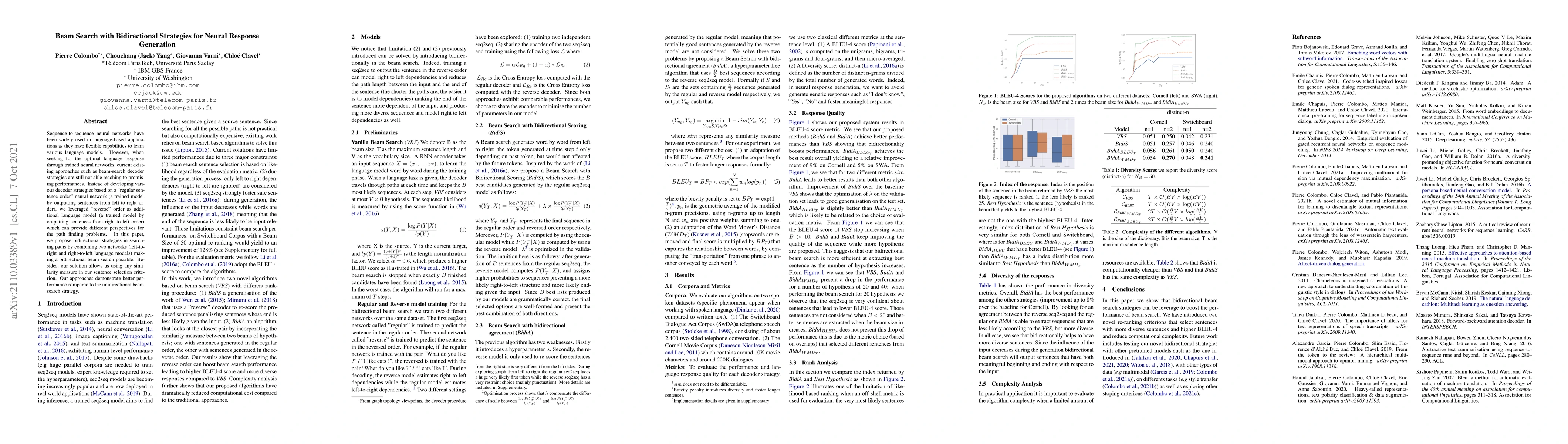 This paper proposes bidirectional beam search strategies for neural response generation by combining left-to-right and right-to-left language models to explore diverse paths. The approach shows improved performance over traditional unidirectional beam search methods.