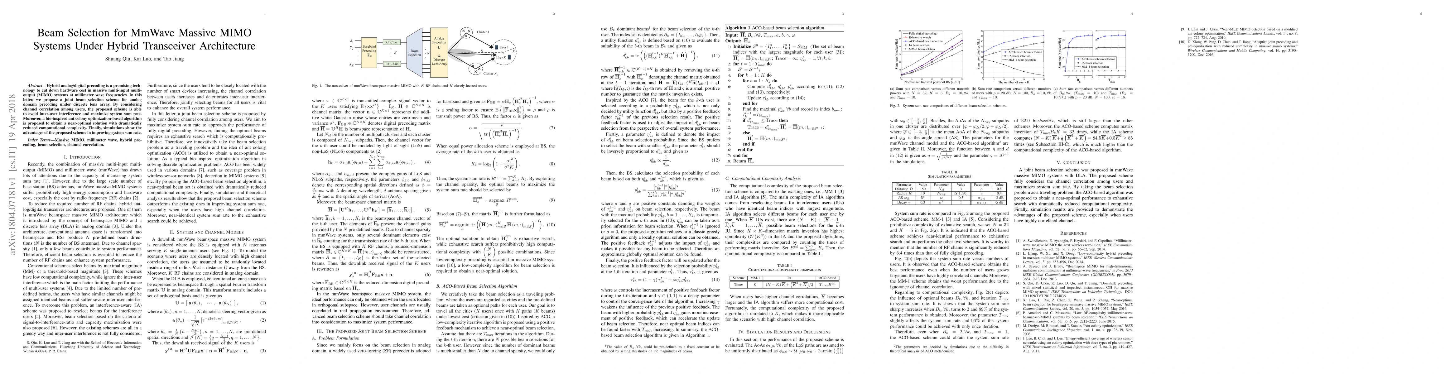 This paper proposes a joint beam selection scheme for mmWave massive MIMO systems using hybrid transceivers, reducing computational complexity while maximizing system sum rate. The proposed algorithm combines channel correlation consideration with bio-inspired optimization to avoid inter-user interference.