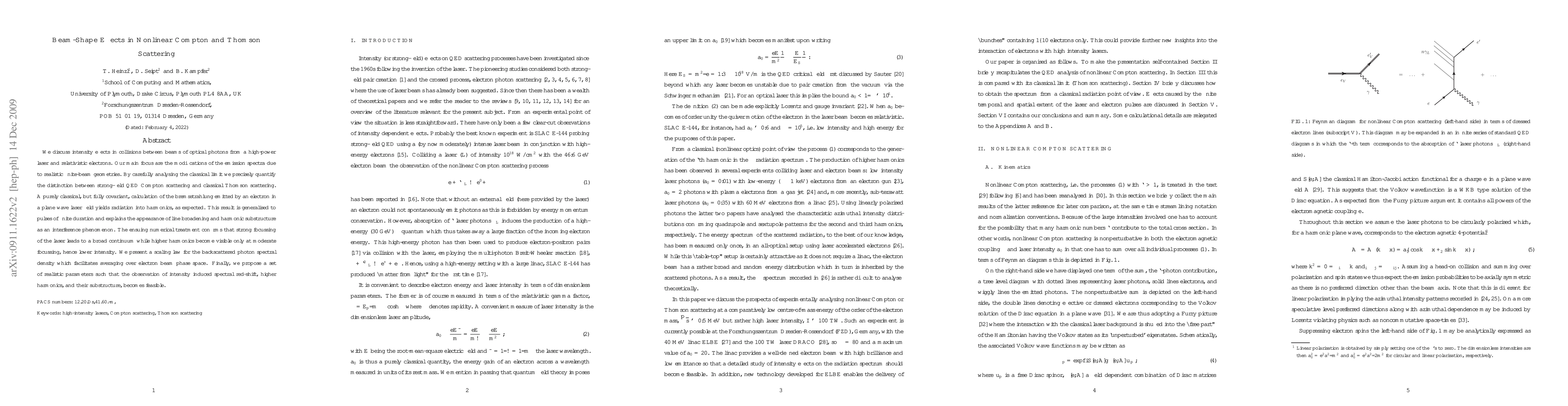 This paper investigates the impact of beam shape on nonlinear Compton and Thomson scattering, focusing on the modifications in emission spectra due to finite-beam geometries. It provides a classical, covariant analysis of bremsstrahlung in laser fields, explaining harmonic substructure and line broadening as interference phenomena, and proposes parameters for observing intensity-induced spectral effects.