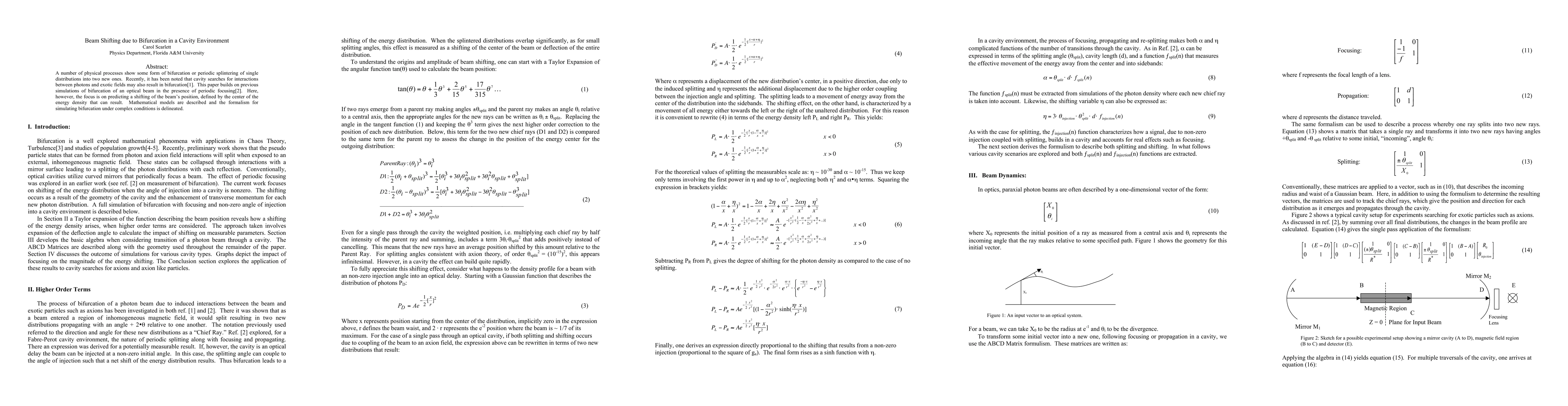 A number of physical processes show some form of bifurcation or periodic splintering of a single distribution into two new ones. Recently, it has been noted that cavity searches for interactions between photons and exotic fields may also result in bifurcation[1]. This paper builds on previous simulations of bifurcation of an optical beam in the presence of periodic focusing [2]. Here, however, the focus is on predicting a shifting of the beam's position, defined by the center of the energy density, that can result. Mathematical models are described and the formalism for simulating bifurcation under complex conditions is delineated.