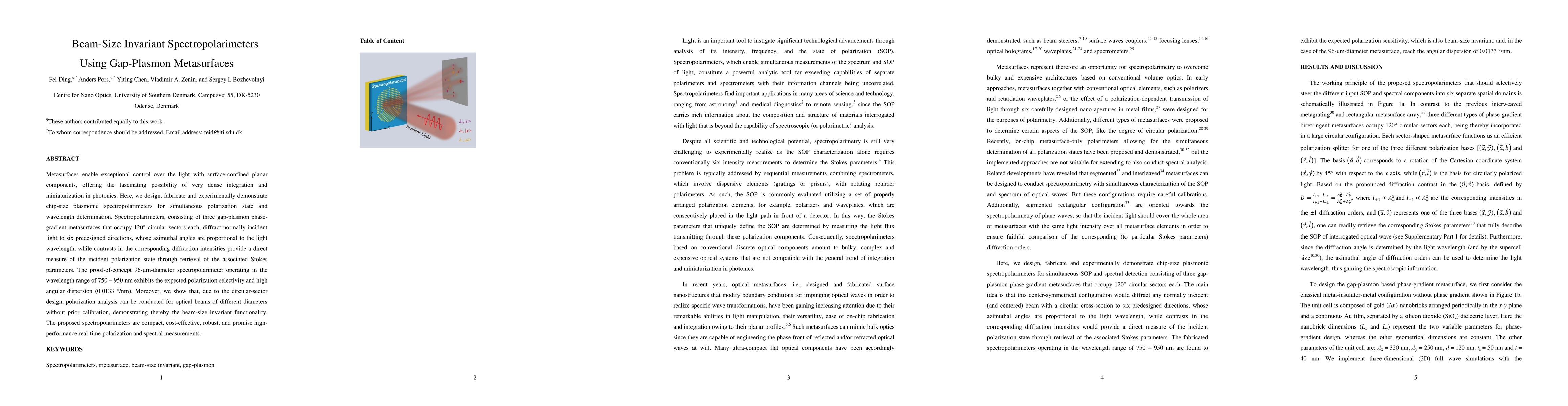 This research develops compact, chip-size plasmonic spectropolarimeters using gap-plasmon metasurfaces, demonstrating simultaneous polarization state and wavelength determination with beam-size invariant functionality. The 96-{\mu}m device shows high angular dispersion and polarization selectivity across a 750-950nm wavelength range.