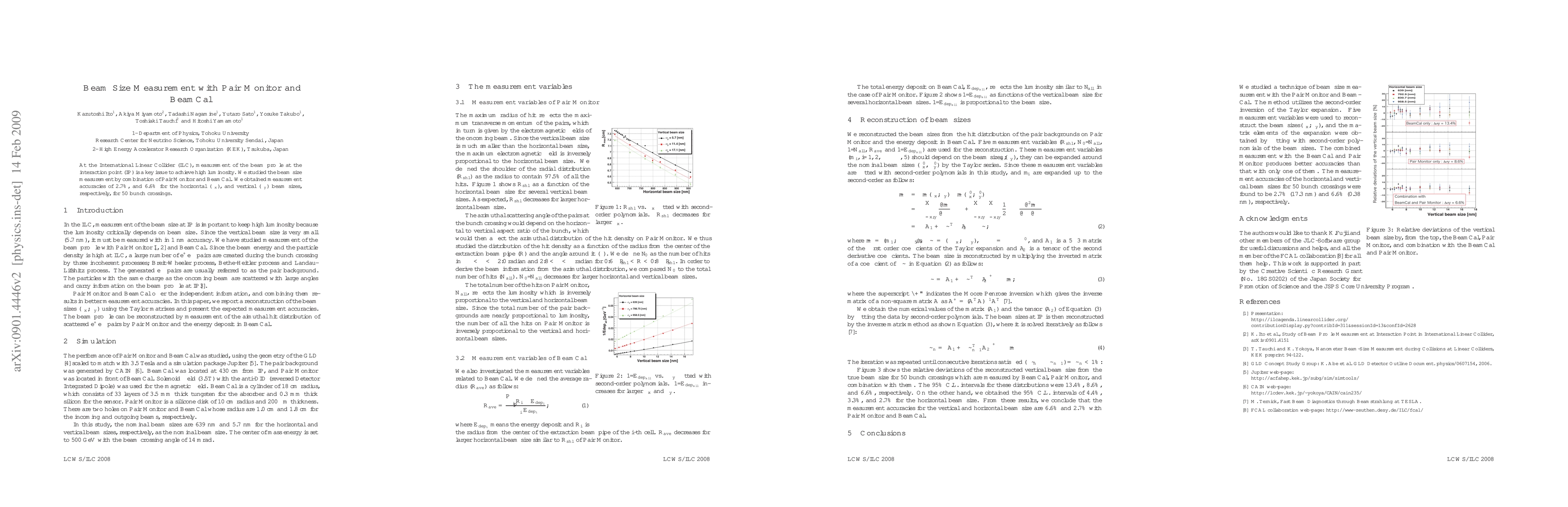 This paper investigates beam size measurement techniques using a combination of Pair Monitor and BeamCal at the International Linear Collider (ILC), achieving accuracies of 2.7% for horizontal and 6.6% for vertical beam sizes over 50 bunch crossings. The study emphasizes the importance of precise beam profile measurement for high luminosity.