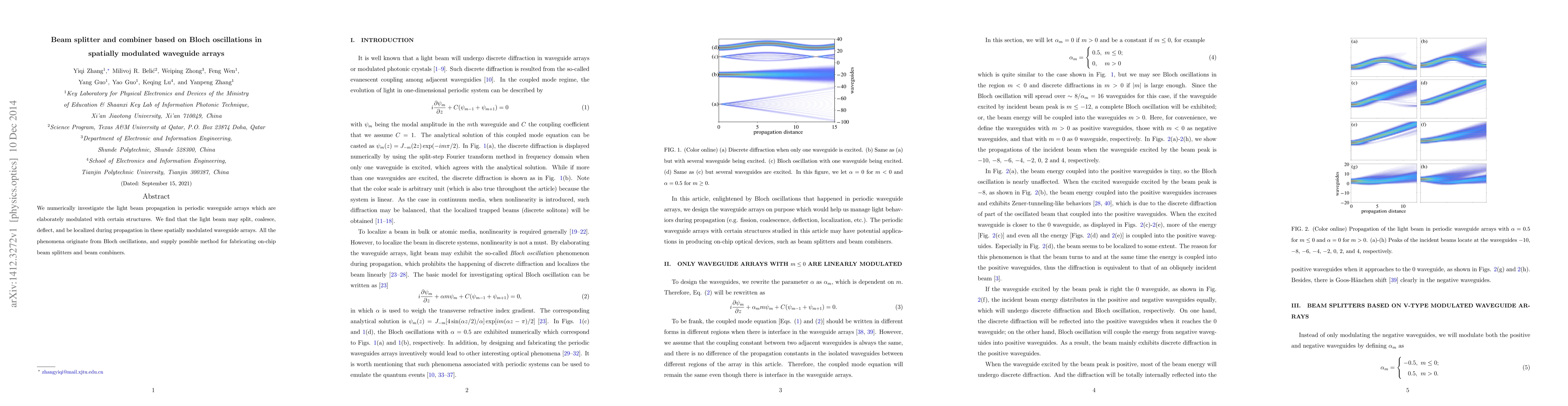 This paper numerically explores light propagation in spatially modulated waveguide arrays, revealing phenomena like beam splitting, coalescing, deflection, and localization due to Bloch oscillations, which could enable the fabrication of on-chip beam splitters and combiners.