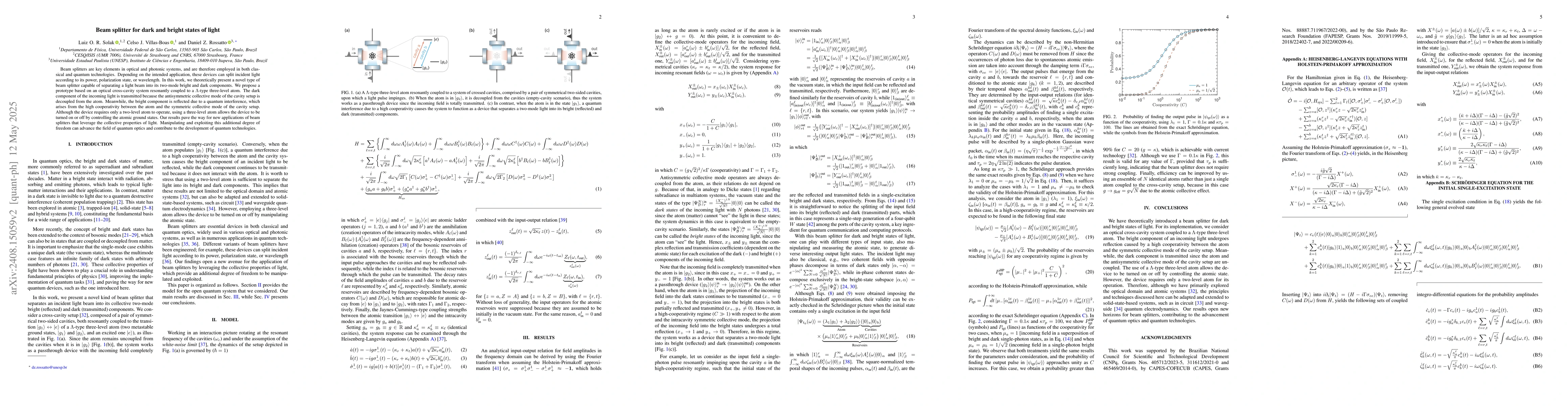 Beam splitters are indispensable elements in optical and photonic systems, and are therefore employed in both classical and quantum technologies. Depending on the intended application, these devices can divide incident light according to its power, polarization state, or wavelength. In this work, we theoretically present a novel type of beam splitter capable of separating a light beam into its two-mode bright and dark components. We propose a prototype based on an optical cross-cavity system resonantly coupled to a $\Lambda$-type three-level atom. The dark component of the incoming light is transmitted because the antisymmetric collective mode of the cavity setup is decoupled from the atom. Meanwhile, in a high-cooperativity regime, the bright component is reflected due to Autler-Townes splitting, which arises from the strong coupling between the atom and the symmetric collective mode of the cavity setup. Although the device requires only a two-level atom to operate, using a three-level atom allows the device to be turned on or off by controlling the atomic ground state. Our results pave the way for new applications of beam splitters that leverage the collective properties of light. Manipulating and exploiting this additional degree of freedom can advance the field of quantum optics and contribute to the development of quantum technologies.
