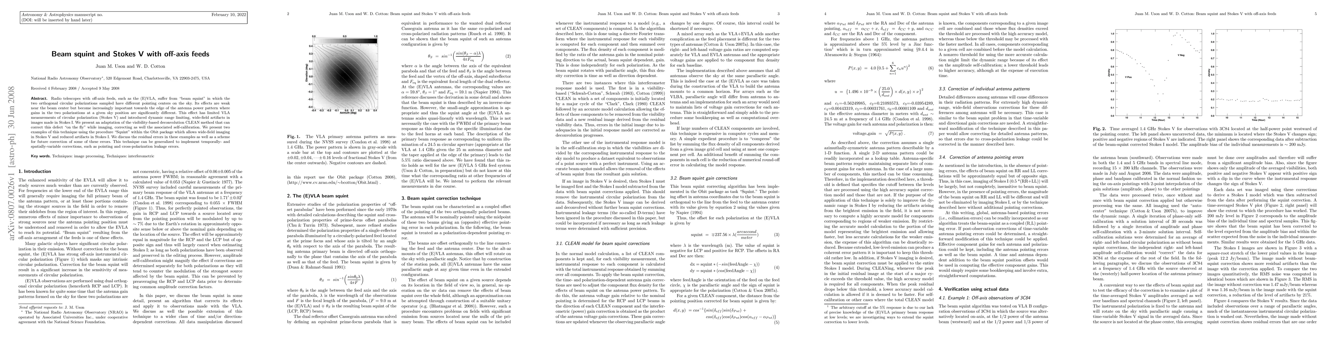 Radio telescopes with off-axis feeds, such as the (E)VLA, suffer from "beam squint" in which the two orthogonal circular polarizations sampled have different pointing centers on the sky. Its effects are weak near the beam center but become increasingly important towards the edge of the antenna power pattern where gains in the two polarizations at a given sky position are significantly different. This effect has limited VLA measurements of circular polarization (Stokes V) and introduced dynamic range limiting, wide-field artifacts in images made in Stokes I. We present an adaptation of the visibility-based deconvolution CLEAN method that can correct this defect "on the fly" while imaging, correcting as well the associated self-calibration. We present two examples of this technique using the procedure "Squint" within the Obit package which allows wide-field imaging in Stokes V and reduced artifacts in Stokes I. We discuss the residual errors in these examples as well as a scheme for future correction of some of these errors. This technique can be generalized to implement temporally- and spatially-variable corrections, such as pointing and cross-polarization leakage errors.