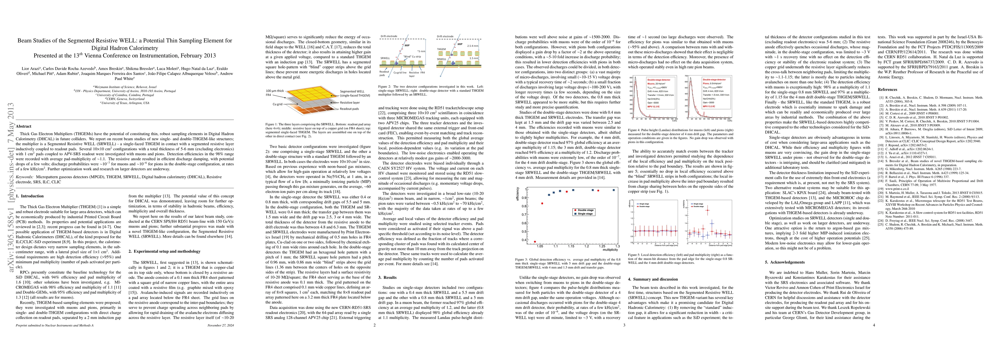 This paper reports on beam studies of Segmented Resistive WELL (SRWELL) structures as potential thin sampling elements for Digital Hadron Calorimetry, achieving high detection efficiencies (98%) and low discharge probabilities ($\sim10^{-7}$ for muons), with ongoing efforts for further optimization and larger detector research.