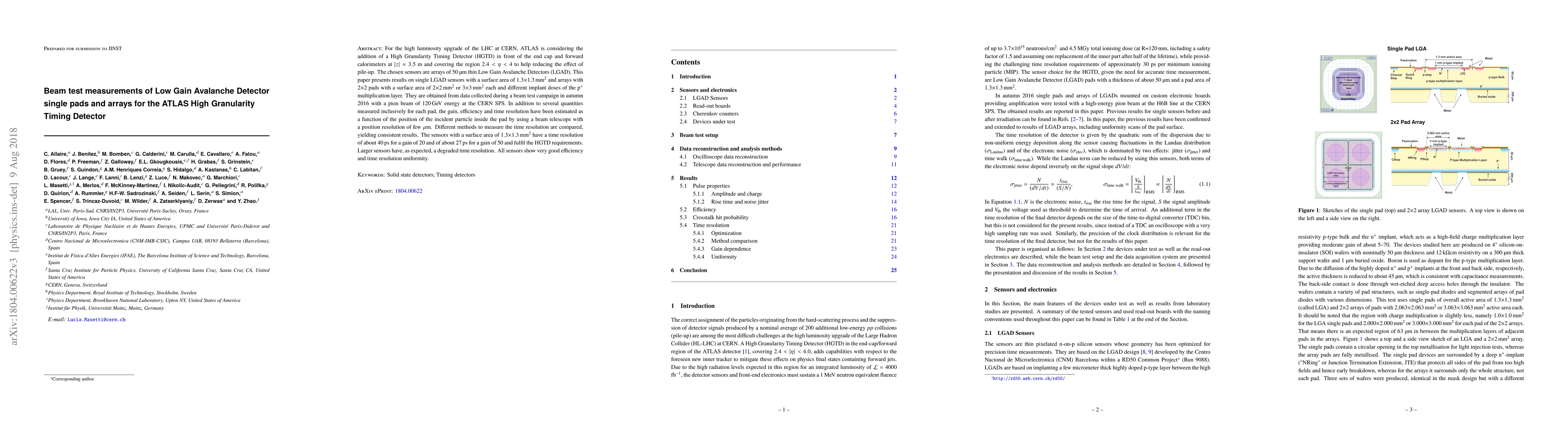 This paper reports on beam test measurements of Low Gain Avalanche Detectors (LGAD) for the ATLAS High Granularity Timing Detector, showing that single pads with 1.3x1.3 mm² achieve a time resolution of about 40 ps at a gain of 20, fulfilling HGTD requirements, while larger arrays exhibit degraded time resolution but maintain excellent efficiency and uniformity.