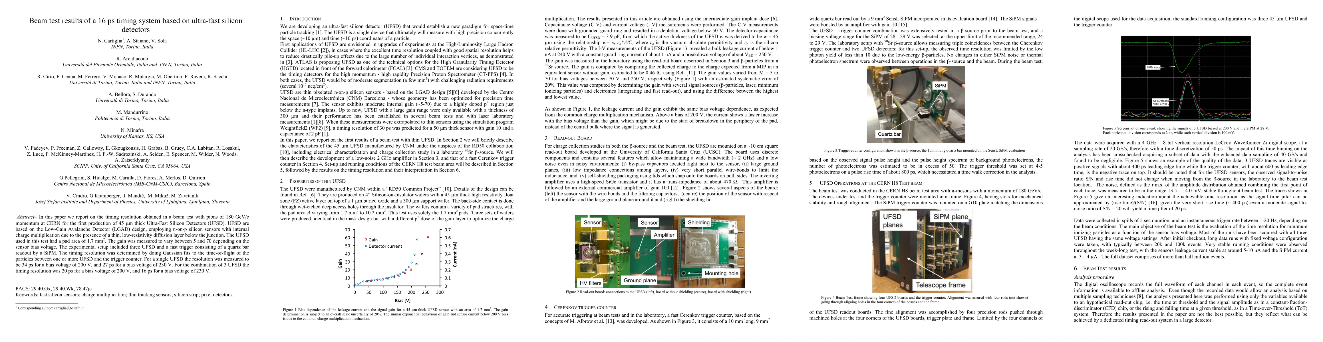 This paper reports on the timing resolution of 50 micro-meter thick Ultra-Fast Silicon Detectors (UFSD) in a beam test with pions, achieving a timing resolution of 35 ps for single UFSD at 200 V and 26 ps at 240 V, with an even better resolution of 20 ps at 200 V and 15 ps at 240 V when combining three UFSD.