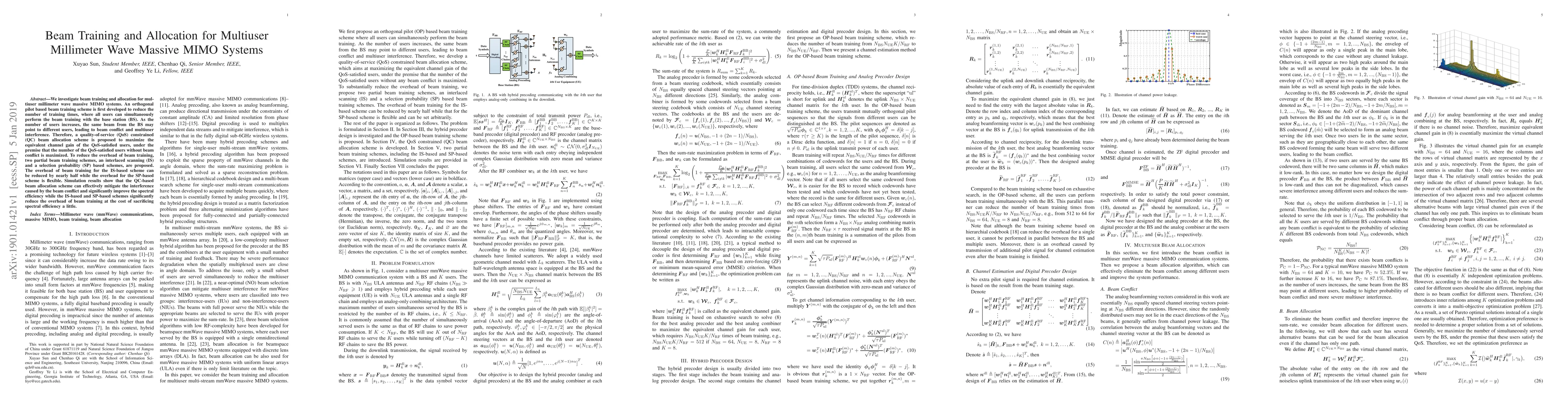 This paper develops an orthogonal pilot-based beam training scheme for multiuser millimeter wave massive MIMO systems to minimize training times and proposes a QoS-constrained beam allocation scheme to maximize channel gain and user satisfaction while mitigating interference. It also introduces partial beam training schemes to further reduce overhead, achieving a balance between efficiency and training cost.