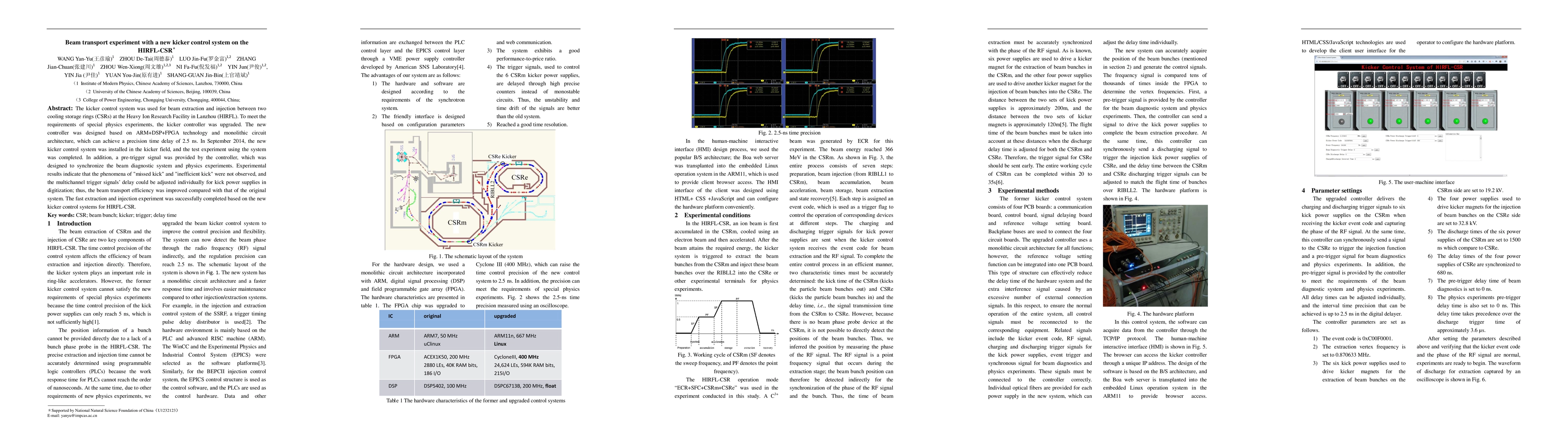 The new kicker control system based on ARM+DSP+FPGA technology improved beam transport efficiency in the HIRFL-CSR by reducing "missed kick" and "inefficient kick" phenomena, achieving precise 2.5 ns time delay and customizable multichannel trigger signals. Successful beam transport experiments were conducted in September 2014.