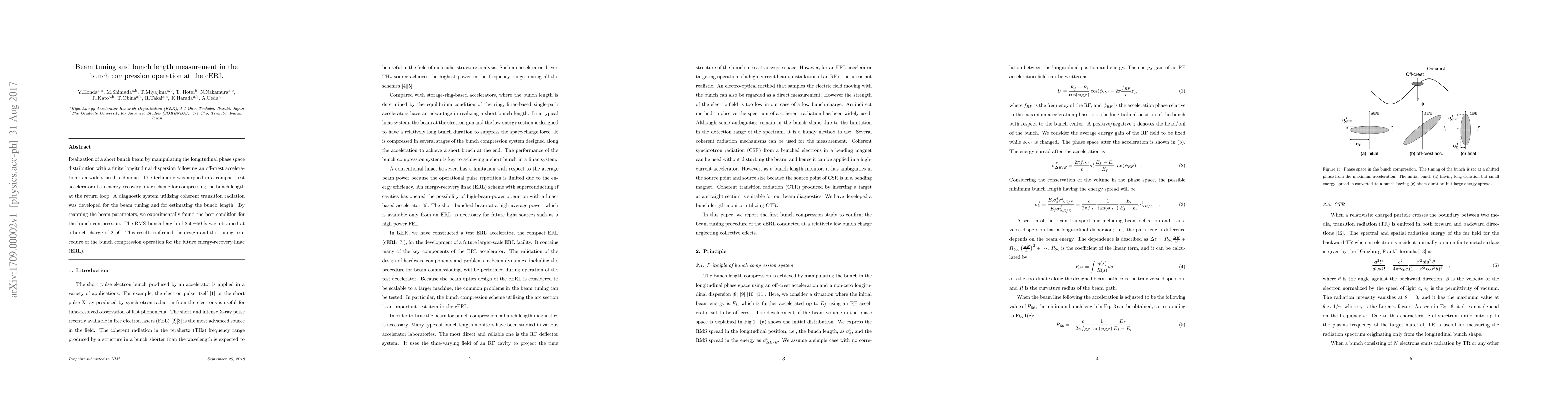 This research applied a technique to compress bunch length in a compact test accelerator of an energy-recovery linac using off-crest acceleration and a diagnostic system based on coherent transition radiation. The optimal conditions for bunch compression were identified, achieving an RMS bunch length of 250±50 fs at a charge of 2 pC, confirming the design and tuning procedures for future energy-recovery linac operations.