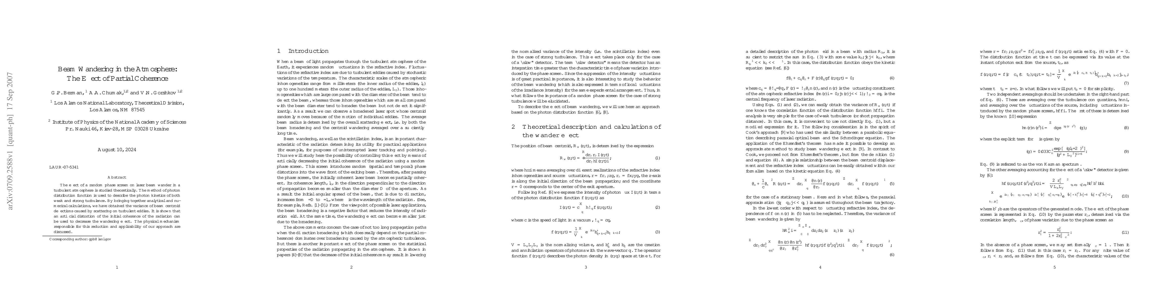 This paper investigates how a random phase screen influences laser beam wander in turbulent atmospheres, using photon distribution function methods. It demonstrates that reducing the initial coherence of radiation can mitigate beam wandering, providing insights into the underlying physical mechanisms.