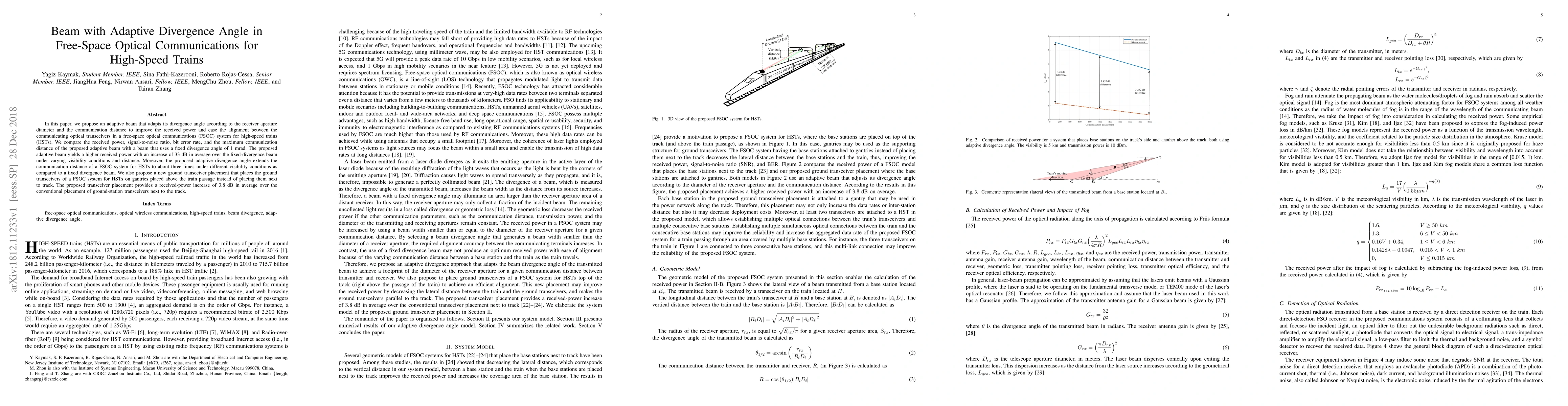 This paper proposes an adaptive beam with a variable divergence angle to improve free-space optical communication (FSOC) for high-speed trains, achieving a 33 dB higher average received power and extending communication distance by about three times compared to a fixed-divergence beam. The new transceiver placement on gantries above train passages also increases average received power by 3.8 dB.