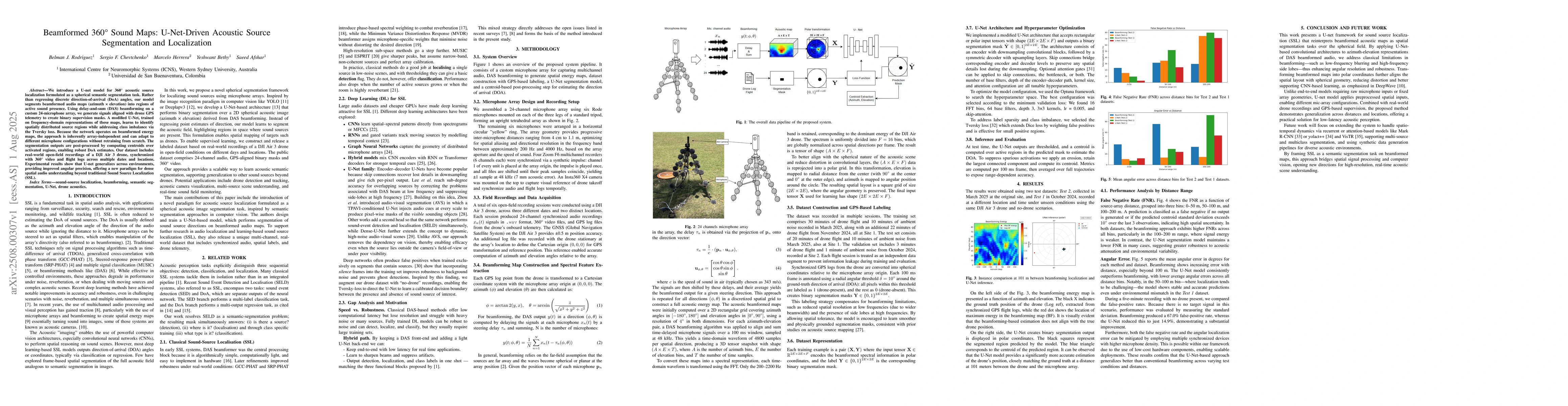 We introduce a U-net model for 360{\deg} acoustic source localization formulated as a spherical semantic segmentation task. Rather than regressing discrete direction-of-arrival (DoA) angles, our model segments beamformed audio maps (azimuth and elevation) into regions of active sound presence. Using delay-and-sum (DAS) beamforming on a custom 24-microphone array, we generate signals aligned with drone GPS telemetry to create binary supervision masks. A modified U-Net, trained on frequency-domain representations of these maps, learns to identify spatially distributed source regions while addressing class imbalance via the Tversky loss. Because the network operates on beamformed energy maps, the approach is inherently array-independent and can adapt to different microphone configurations without retraining from scratch. The segmentation outputs are post-processed by computing centroids over activated regions, enabling robust DoA estimates. Our dataset includes real-world open-field recordings of a DJI Air 3 drone, synchronized with 360{\deg} video and flight logs across multiple dates and locations. Experimental results show that U-net generalizes across environments, providing improved angular precision, offering a new paradigm for dense spatial audio understanding beyond traditional Sound Source Localization (SSL).