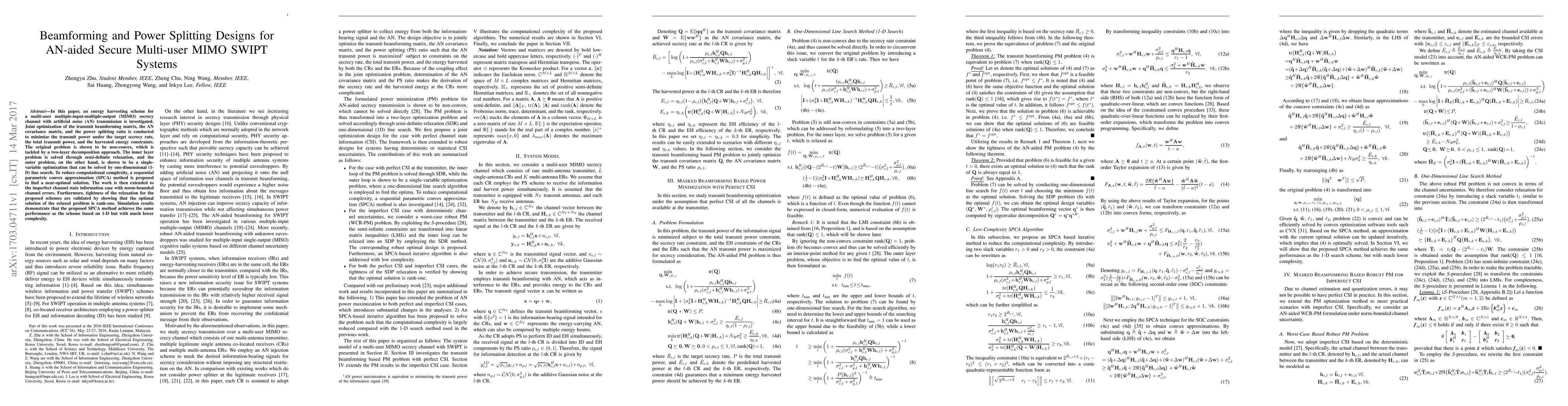 In this paper, an energy harvesting scheme for a multi-user multiple-input-multiple-output (MIMO) secrecy channel with artificial noise (AN) transmission is investigated. Joint optimization of the transmit beamforming matrix, the AN covariance matrix, and the power splitting ratio is conducted to minimize the transmit power under the target secrecy rate, the total transmit power, and the harvested energy constraints. The original problem is shown to be non-convex, which is tackled by a two-layer decomposition approach. The inner layer problem is solved through semi-definite relaxation, and the outer problem, on the other hand, is shown to be a single- variable optimization that can be solved by one-dimensional (1- D) line search. To reduce computational complexity, a sequential parametric convex approximation (SPCA) method is proposed to find a near-optimal solution. The work is then extended to the imperfect channel state information case with norm-bounded channel errors. Furthermore, tightness of the relaxation for the proposed schemes are validated by showing that the optimal solution of the relaxed problem is rank-one. Simulation results demonstrate that the proposed SPCA method achieves the same performance as the scheme based on 1-D but with much lower complexity.