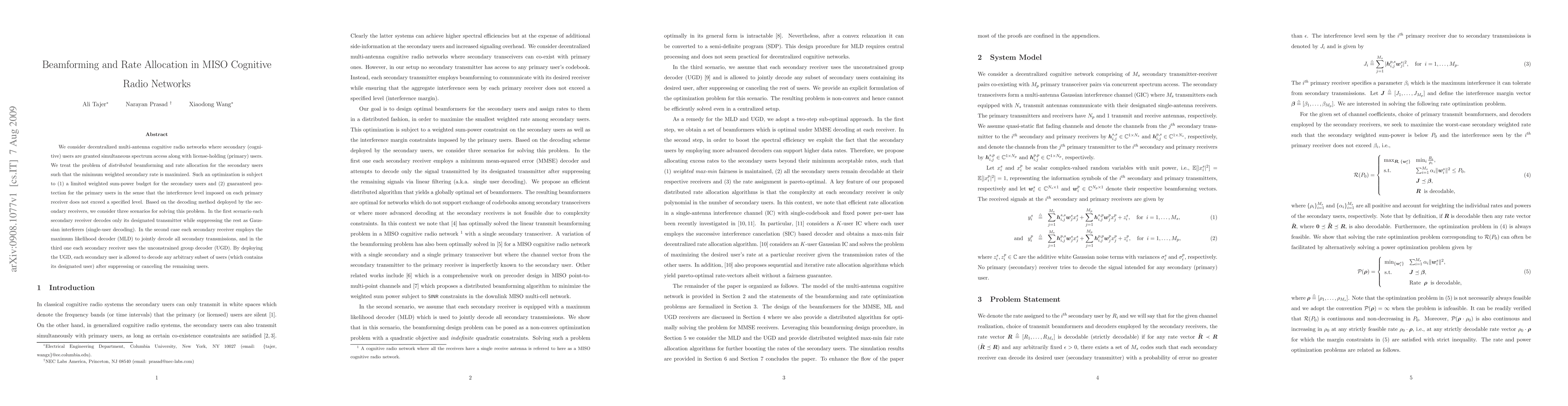 This paper addresses distributed beamforming and rate allocation in multi-antenna cognitive radio networks, aiming to maximize the minimum weighted secondary rate while ensuring interference protection for primary users. Three decoding scenarios are analyzed: single-user decoding, maximum likelihood decoding, and unconstrained group decoding.