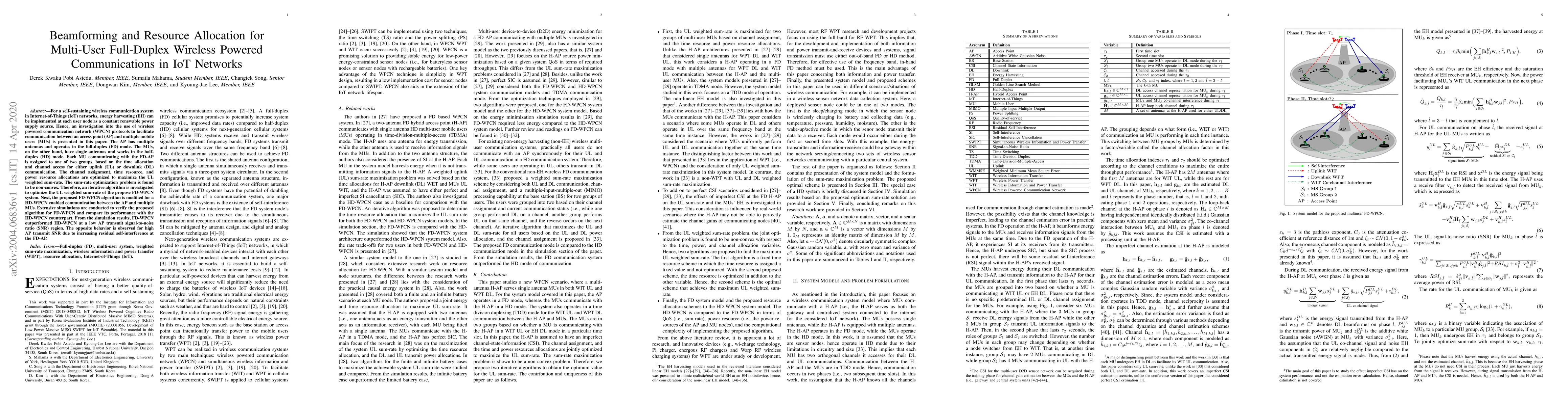 This paper investigates beamforming and resource allocation strategies for multi-user full-duplex wireless powered communication networks in IoT, optimizing channel, time, and power allocation to maximize uplink weighted sum-rate. Simulation results show that full-duplex wireless powered communication outperforms half-duplex in low signal-to-noise ratio regions, but residual self-interference affects performance at high signal-to-noise ratios.