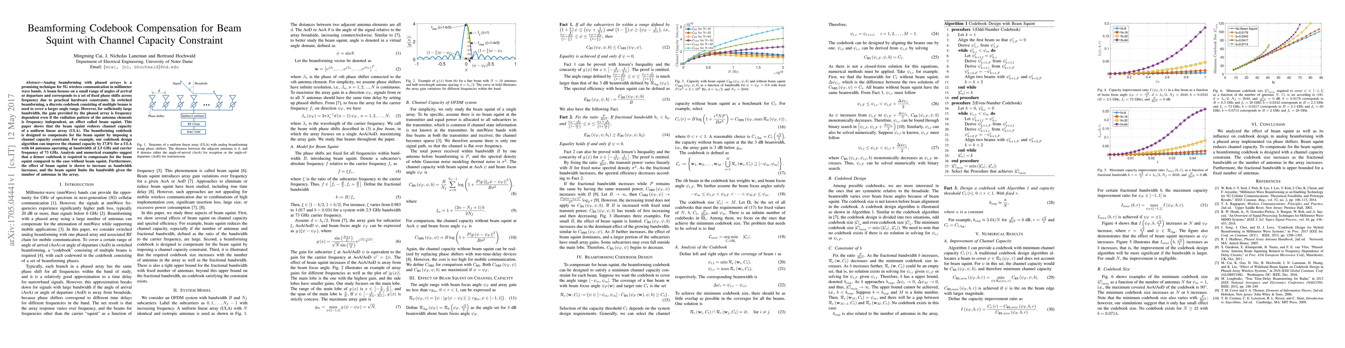 Analog beamforming with phased arrays is a promising technique for 5G wireless communication in millimeter wave bands. A beam focuses on a small range of angles of arrival or departure and corresponds to a set of fixed phase shifts across frequency due to practical hardware constraints. In switched beamforming, a discrete codebook consisting of multiple beams is used to cover a larger angle range. However, for sufficiently large bandwidth, the gain provided by the phased array is frequency dependent even if the radiation pattern of the antenna elements is frequency independent, an effect called beam squint. This paper shows that the beam squint reduces channel capacity of a uniform linear array (ULA). The beamforming codebook is designed to compensate for the beam squint by imposing a channel capacity constraint. For example, our codebook design algorithm can improve the channel capacity by 17.8% for a ULA with 64 antennas operating at bandwidth of 2.5 GHz and carrier frequency of 73 GHz. Analysis and numerical examples suggest that a denser codebook is required to compensate for the beam squint compared to the case without beam squint. Furthermore, the effect of beam squint is shown to increase as bandwidth increases, and the beam squint limits the bandwidth given the number of antennas in the array.