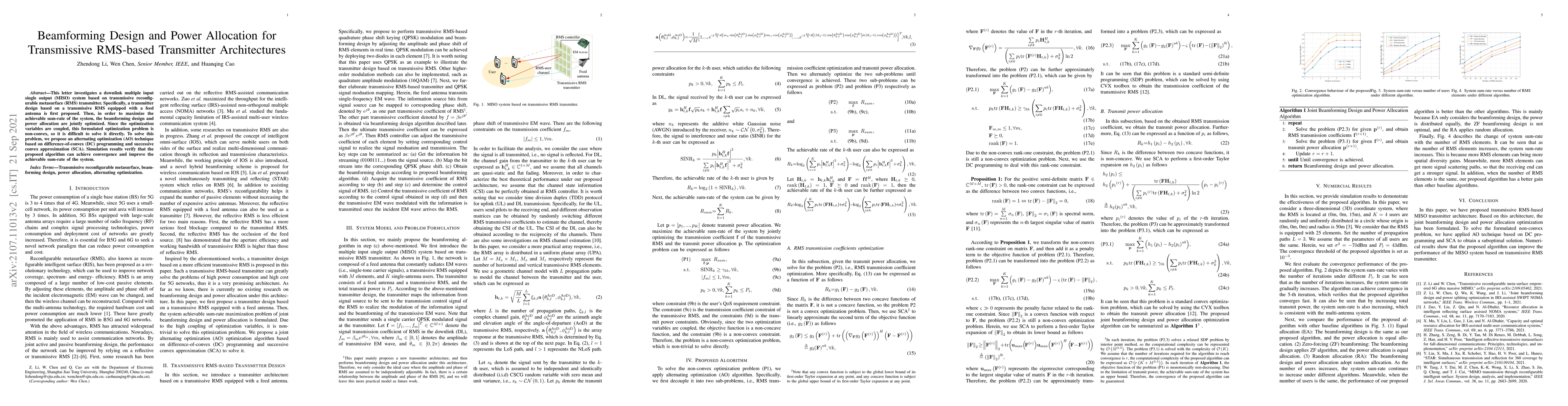 This paper proposes a beamforming design and power allocation method for a MISO system using a transmissive RMS transmitter, optimizing jointly to maximize sum-rate. An alternating optimization technique based on DC programming and SCA is introduced to solve the non-convex optimization problem, achieving convergence and improved sum-rate.