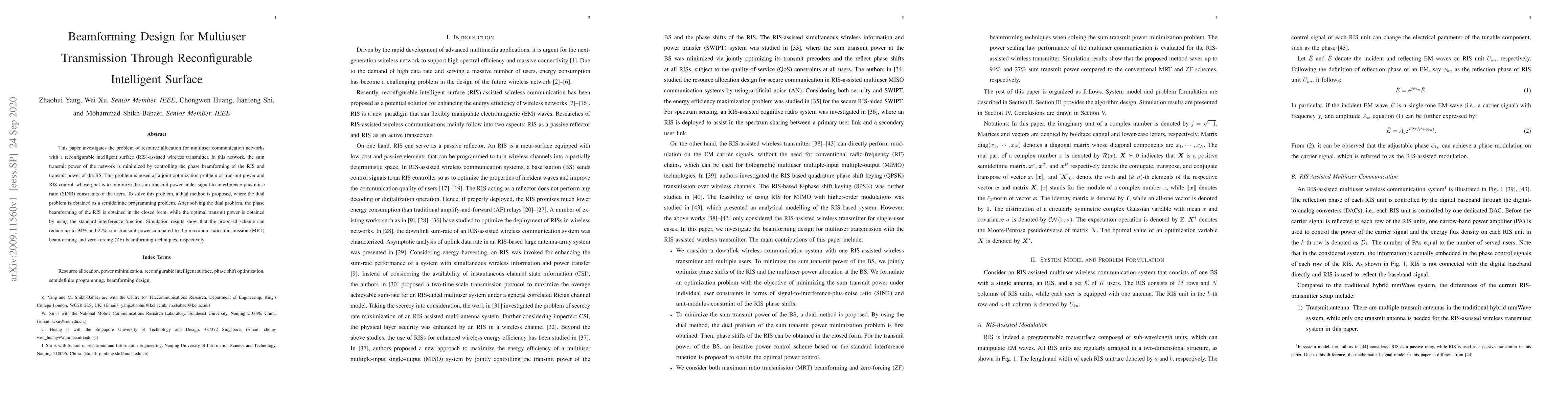 This paper proposes a dual method for optimizing resource allocation in multiuser networks using a reconfigurable intelligent surface (RIS) to minimize sum transmit power. The method yields closed-form solutions for RIS phase beamforming and optimal transmit power, achieving significant reductions in power compared to traditional beamforming techniques.