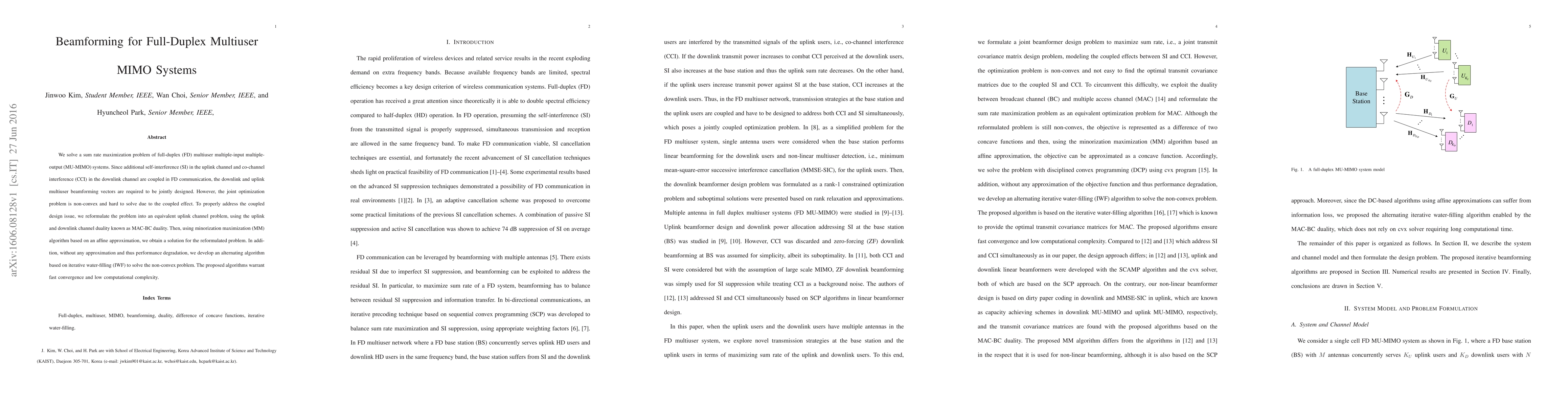 This paper proposes algorithms to maximize the sum rate for full-duplex multiuser MIMO systems, addressing the coupled self-interference and co-channel interference through reformulation and optimization techniques. The study introduces an MM-based algorithm and an alternating iterative water-filling method for efficient joint beamforming design.
