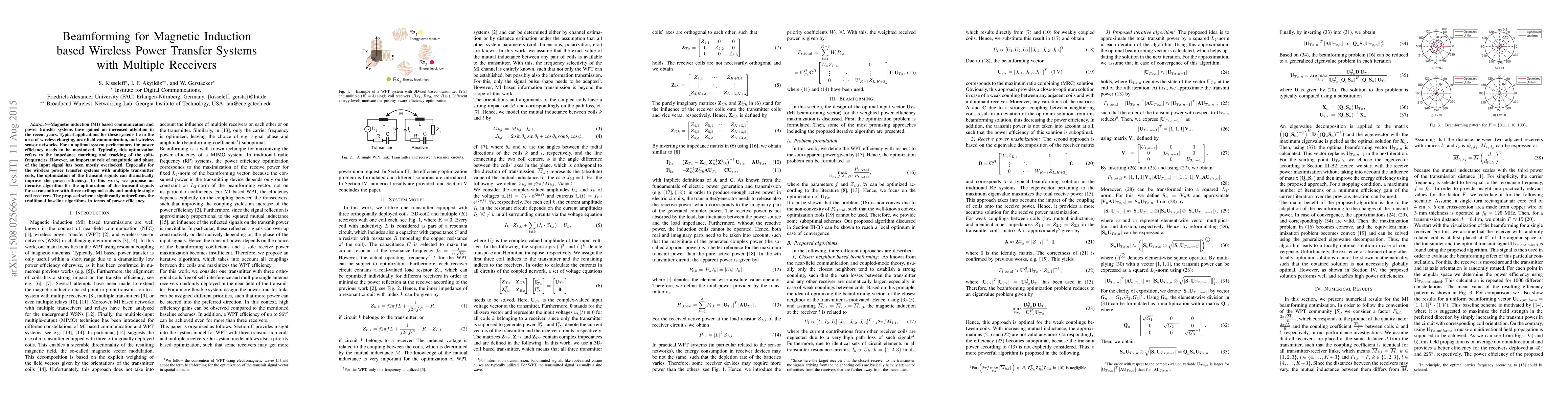 This paper proposes an iterative algorithm to optimize beamforming for magnetic induction-based wireless power transfer systems with multiple receivers, focusing on improving power efficiency by optimizing the magnitude and phase of transmit signals. The proposed method outperforms traditional baseline algorithms in achieving higher power efficiency.
