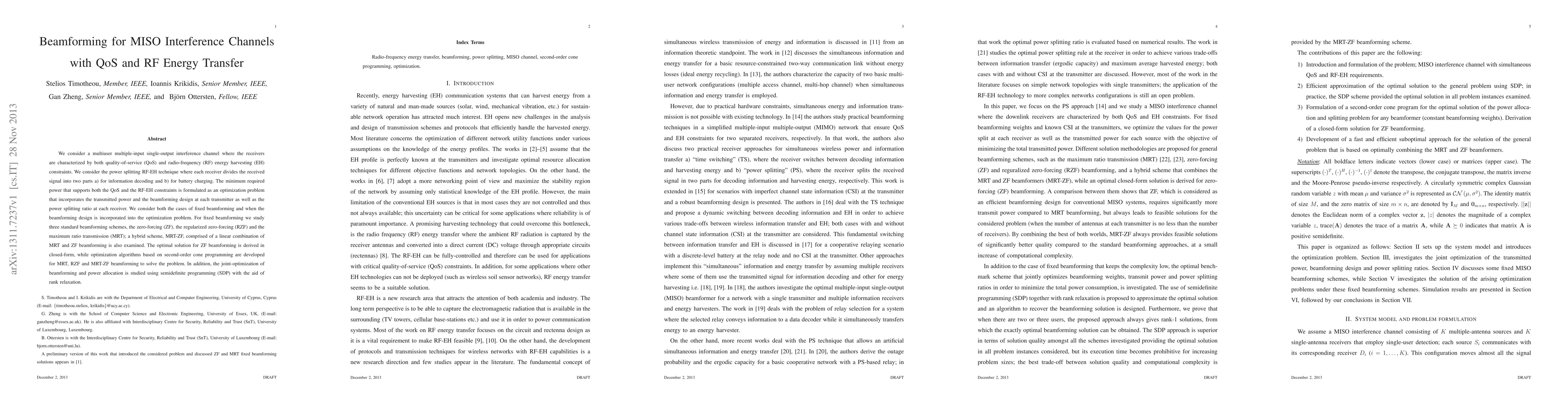 This paper investigates beamforming strategies for multiuser MISO interference channels under QoS and RF energy harvesting constraints, employing power splitting techniques. It optimizes the transmitted power and beamforming design to meet both QoS and RF-EH requirements, exploring fixed beamforming schemes like ZF, RZF, and MRT, and a hybrid MRT-ZF scheme, alongside joint optimization using SDP.