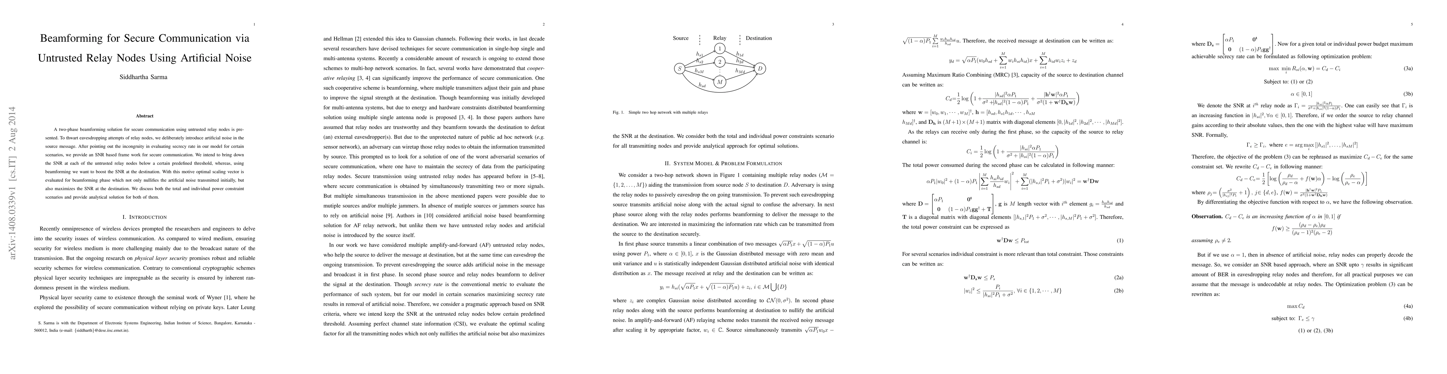 This paper presents a two-phase beamforming approach for secure communication through untrusted relay nodes, using artificial noise to thwart eavesdropping. It evaluates the optimal scaling vector to minimize SNR at untrusted relays while maximizing SNR at the destination, under both total and individual power constraints.