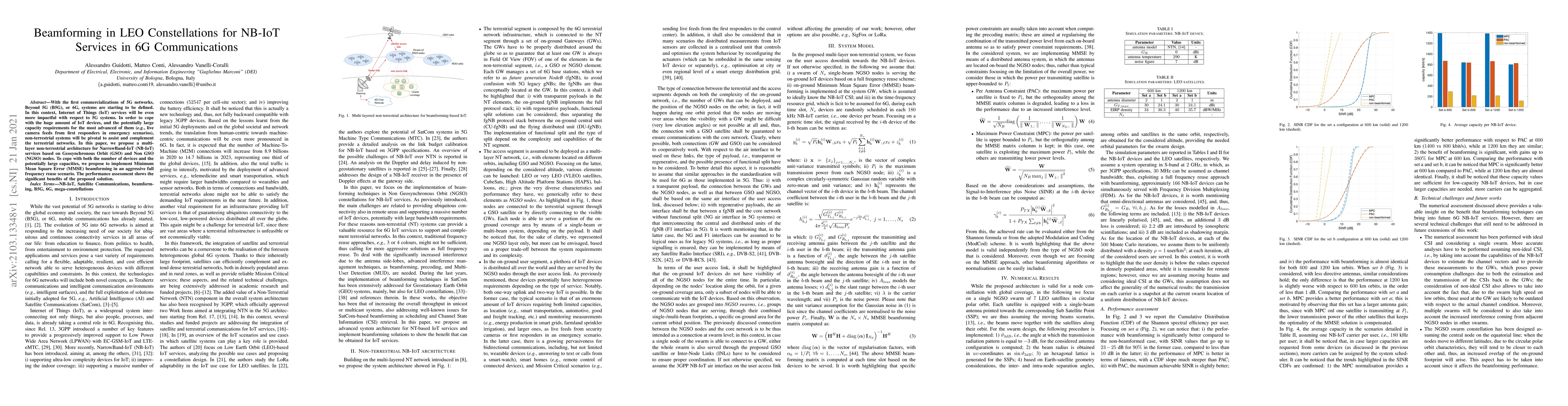 With the first commercializations of 5G networks, Beyond 5G (B5G), or 6G, systems are starting to be defined. In this context, Internet of Things (IoT) services will be even more impactful with respect to 5G systems. In order to cope with the huge amount of IoT devices, and the potentially large capacity requirements for the most advanced of them (e.g., live camera feeds from first responders in emergency scenarios), non-terrestrial systems will be pivotal to assist and complement the terrestrial networks. In this paper, we propose a multi-layer non-terrestrial architecture for NarrowBand-IoT (NB-IoT) services based on Geosynchronous Orbit (GSO) and Non GSO (NGSO) nodes. To cope with both the number of devices and the potentially large capacities, we propose to implement Minimum Mean Square Error (MMSE) beamforming in an aggressive full frequency reuse scenario. The performance assessment shows the significant benefits of the proposed solution.