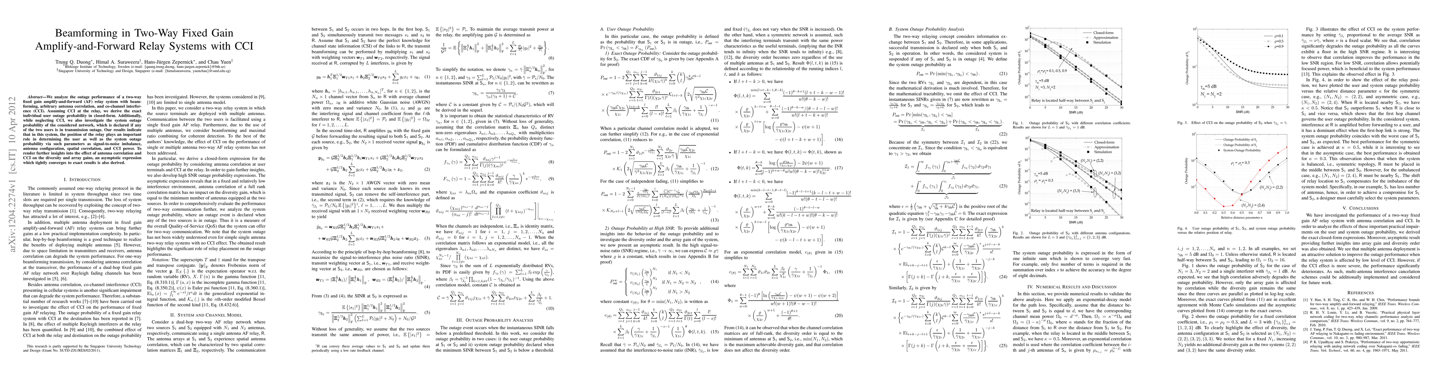 This paper analyzes the outage performance of a two-way fixed gain AF relay system with beamforming, antenna correlation, and co-channel interference (CCI). The study derives exact closed-form expressions for individual user outage probability and system outage probability, highlighting the relay's position as a critical factor influenced by signal-to-noise imbalance, antenna configuration, spatial correlation, and CCI power.