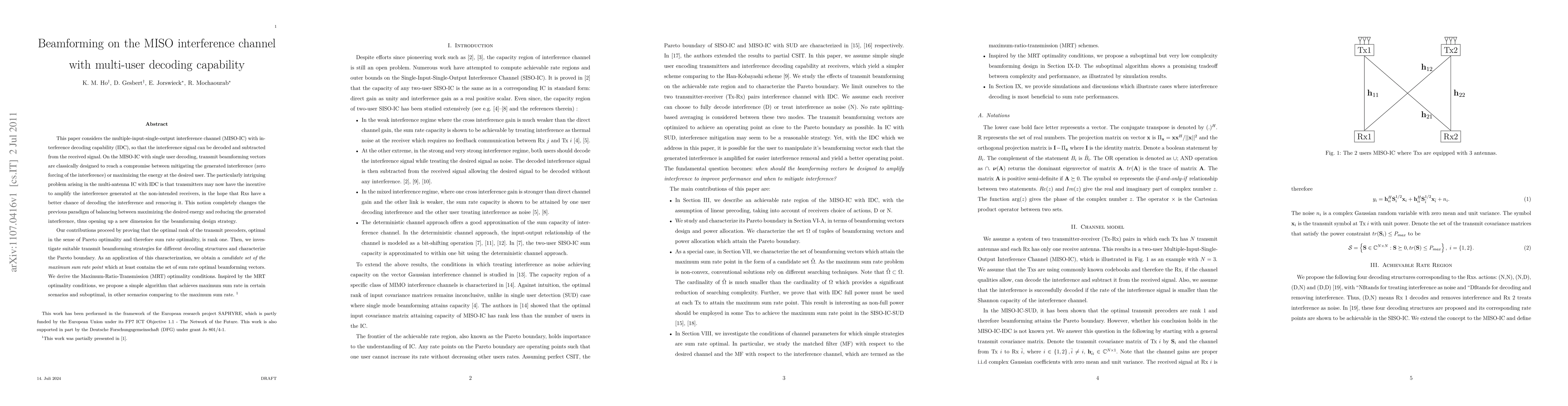This paper considers the multiple-input-single-output interference channel (MISO-IC) with interference decoding capability (IDC), so that the interference signal can be decoded and subtracted from the received signal. On the MISO-IC with single user decoding, transmit beamforming vectors are classically designed to reach a compromise between mitigating the generated interference (zero forcing of the interference) or maximizing the energy at the desired user. The particularly intriguing problem arising in the multi-antenna IC with IDC is that transmitters may now have the incentive to amplify the interference generated at the non-intended receivers, in the hope that Rxs have a better chance of decoding the interference and removing it. This notion completely changes the previous paradigm of balancing between maximizing the desired energy and reducing the generated interference, thus opening up a new dimension for the beamforming design strategy. Our contributions proceed by proving that the optimal rank of the transmit precoders, optimal in the sense of Pareto optimality and therefore sum rate optimality, is rank one. Then, we investigate suitable transmit beamforming strategies for different decoding structures and characterize the Pareto boundary. As an application of this characterization, we obtain a candidate set of the maximum sum rate point} which at least contains the set of sum rate optimal beamforming vectors. We derive the Maximum-Ratio-Transmission (MRT) optimality conditions. Inspired by the MRT optimality conditions, we propose a simple algorithm that achieves maximum sum rate in certain scenarios and suboptimal, in other scenarios comparing to the maximum sum rate.
