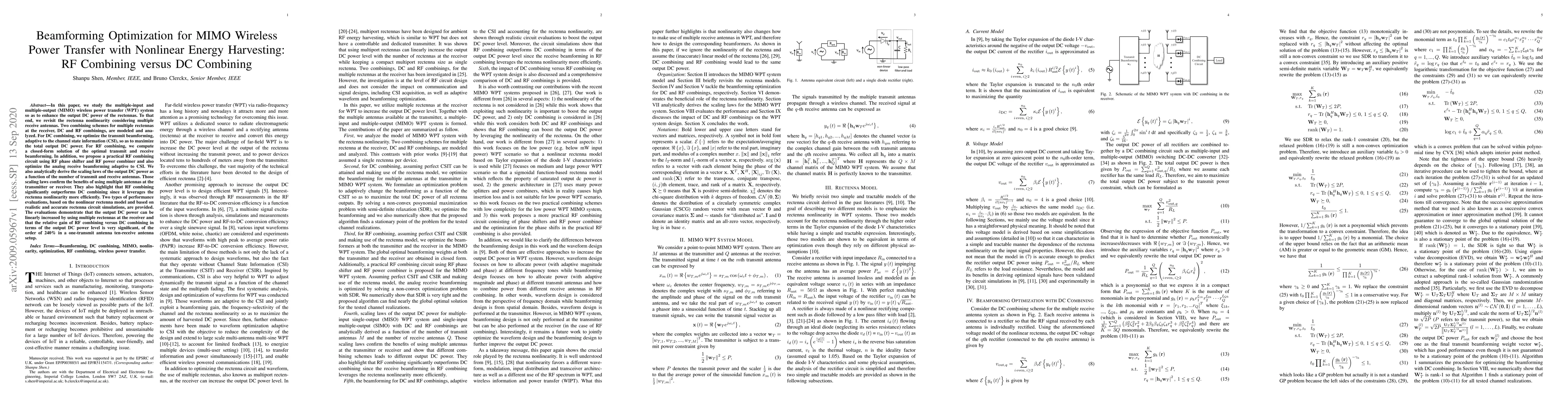 This paper optimizes beamforming for MIMO wireless power transfer with nonlinear energy harvesting, comparing DC and RF combining schemes. RF combining significantly outperforms DC combining, achieving up to 240% higher output DC power due to more efficient exploitation of rectenna nonlinearity.